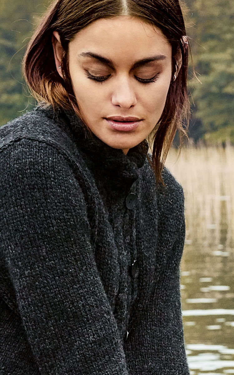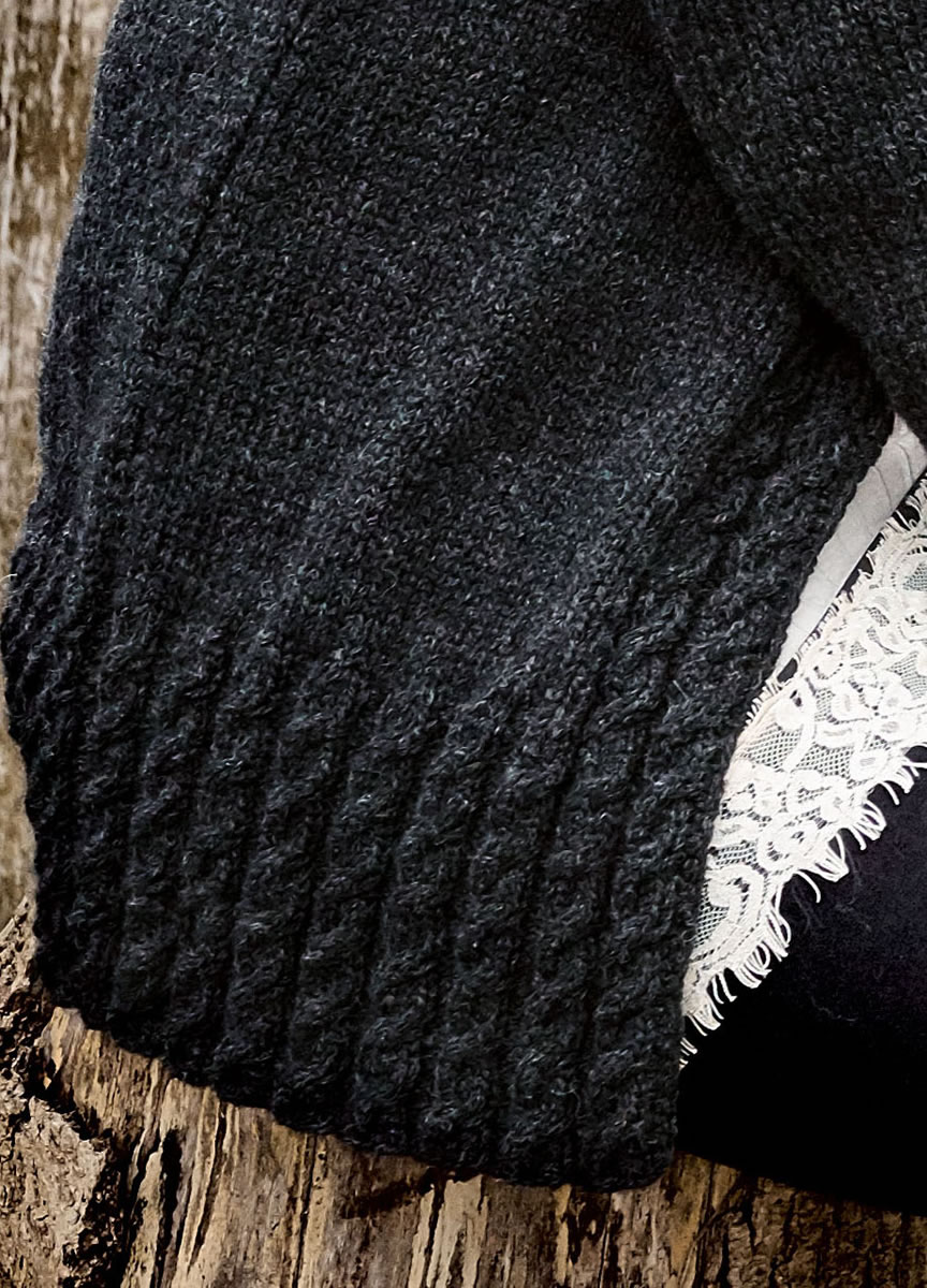 500 (550, 600) g of Lana Grossa Alta Moda Alpaca (90% alpaca, 5% pure wool, 5% polyamide; 140 m/50 g) in Charcoal (col 13). Size 6 and 7 mm needles; size 6 mm circular needle, 40 cm long; cable needle [cn]; size 5 mm crochet hook; 5 buttons.