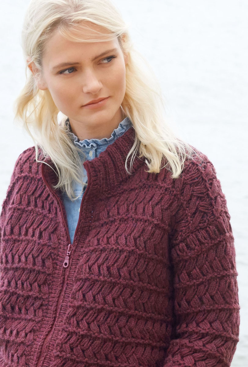 700 g of Lana Grossa Alta Moda Cashmere 16 (78% superfine Merino, 12% cashmere, 10% nylon; 110 m/50 g) in Burgundy (col 27). Size 6 and 7 mm needles; size 6 mm circular needle, 60 cm long; zipper in burgundy [by PRYM, item 490400, S4, col 750].
