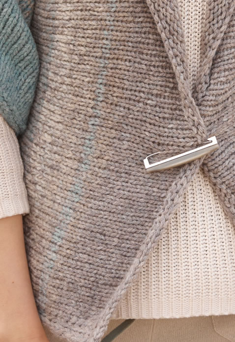 150 (175, 200) g of Lana Grossa Alta Moda Superbaby Fine (63% Merino wool, 27% alpaca, 10% polyamide; 115m/25g) in Heathered Grey/Beige (col 6) and 75 (100, 125) g in Heathered Mint/Grey (col 18) and 125 (150, 175) g of Lana Grossa Alta Moda Superbaby Fine Degradè (63% Merino wool, 27% alpaca,10% polyamide; 115m/25g) in Beige/Grège/Grey/Blue (col 111). Size 8 mm needles; 1 pin closure in Heathered Light Grey [by Union Knopf, item 500334, 80 mm long]. 6) and 75 (100, 125) g in Heathered Mint/Grey (col 18) and 125 (150, 175) g of Lana Grossa Alta Moda Superbaby Fine Degradè (63% Merino wool, 27% alpaca, 10% polyamide; 115m/25g) in Beige/Grège/Grey/Blue (col 111). Size 8 mm needles; 1 pin closure in Heathered Light Grey [by Union Knopf, item 500334, 80 mm long].