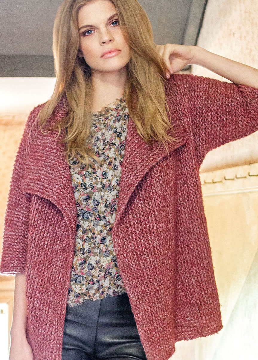 300 (350, 400) g each of Lana Grossa Anima (51% baby alpaca, 34% cotton, 15% polyamide; 160 m/50 g) in Dark Red Heather (col 5) and Burgundy Heather (col 6). Size 7 mm needles; size 7 mm circular needle, 100 cm long