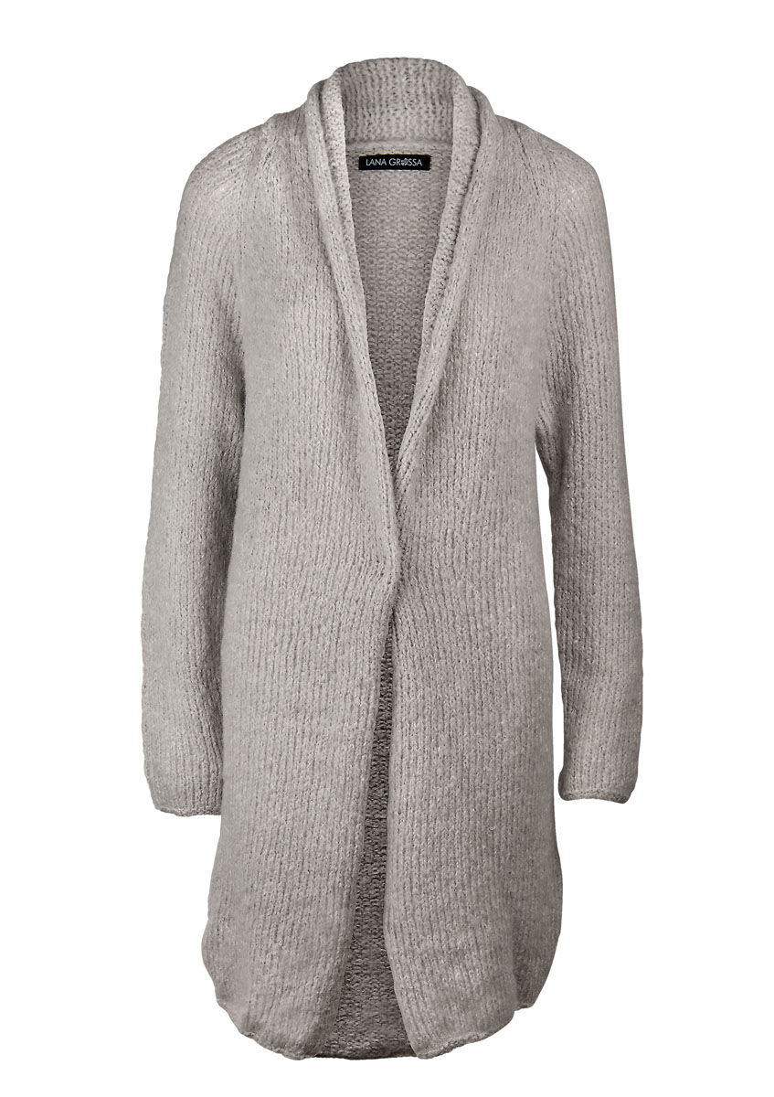 300 (350, 400) g of Lana Grossa Anima (51% alpaca, 34% cotton, 15% polyamide; 160 m/50 g) in Silver Grey Melange (col 2). Size 6.5 mm needles; one snap button