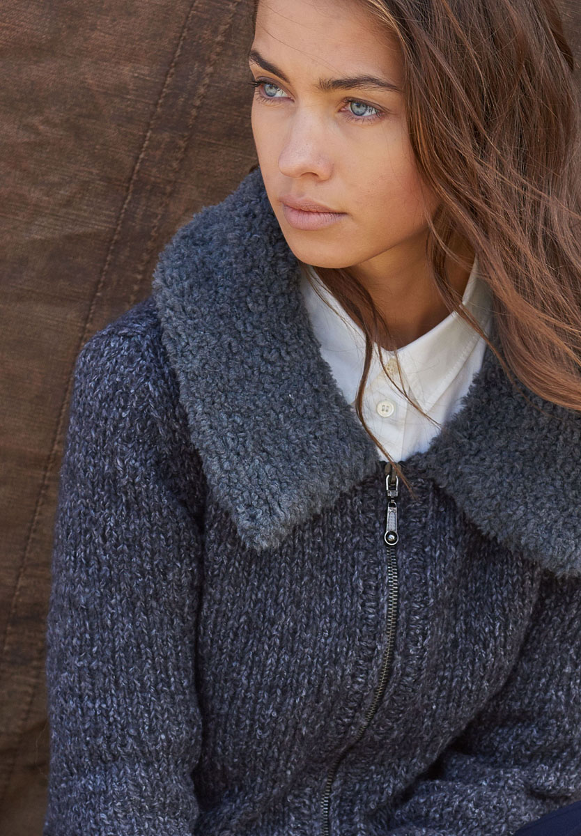 200 (250) g of Lana Grossa Anima (51% baby alpaca, 34% cotton, 15% polyamide; 160 m/50 g) in Charcoal Melange (col 9) and 100 g of Lana Grossa Micio (60% Merino wool, 25% polyamide, 15% baby camel; 100 m/50 g) in Dark Grey (col 6). Size 5.5 and 6 mm needles; two size 6 mm circular needles, each 60 cm long; size 7 mm circular needle, 60 cm long; one 45 cm long zipper in black [by PRYM item 482330].