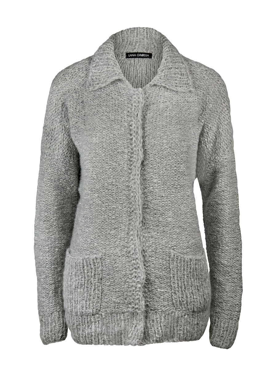 300 (350, 400) g of Lana Grossa Anima (51% alpaca, 34% cotton, 15% polyamide; 160 m/50 g) in Silver Grey Melange (col 2) and 150 (175, 200) g of Lana Grossa Silkhair Paillettes (61% mohair, 17% polyamide, 11% silk, 11% pure wool; 155 m/25 g) in Grey (col 410). Size 6.5, 7 and 8 mm needles; size 6.5 mm circular needle, 40 cm long; five 25 mm snap buttons