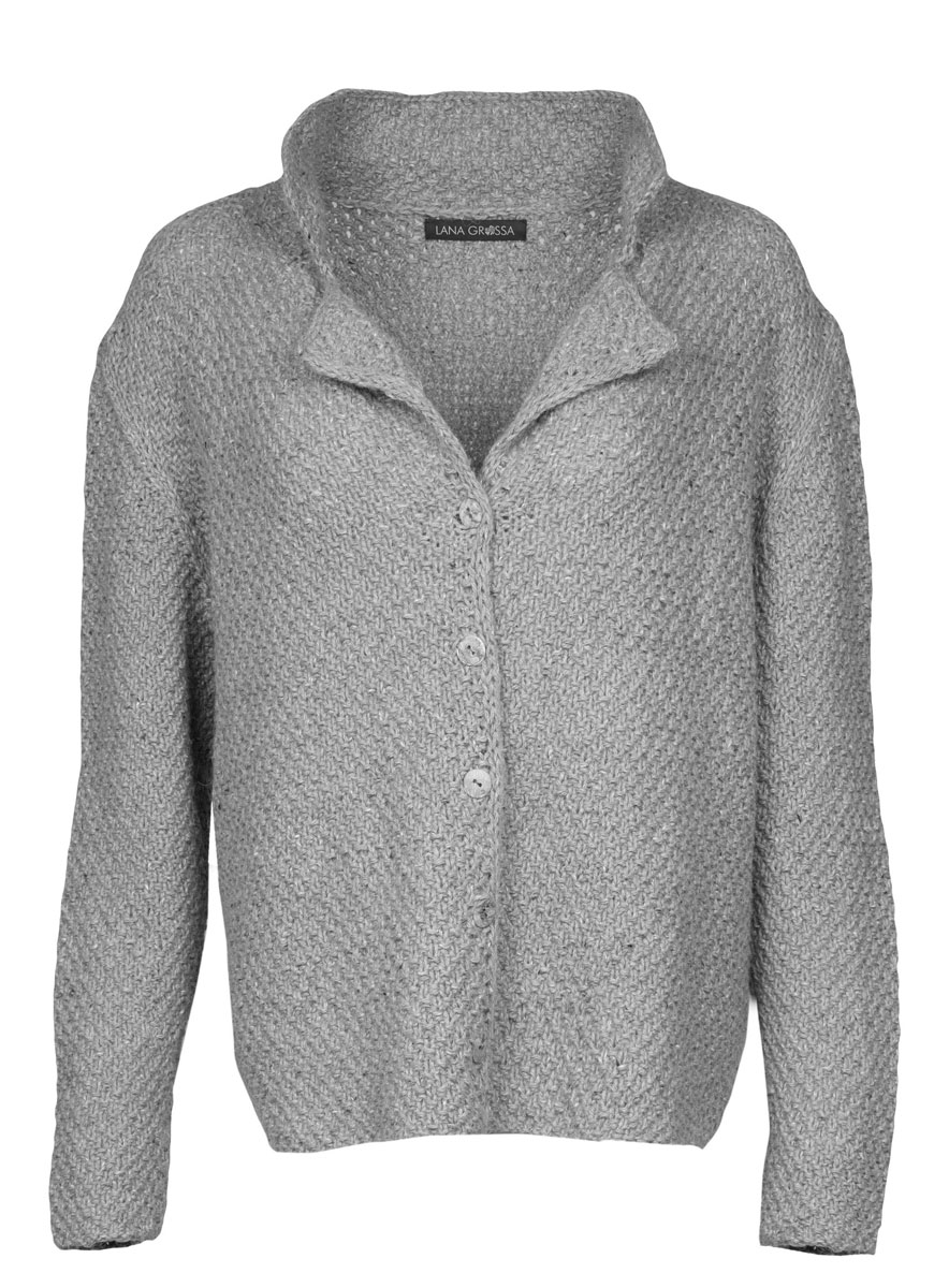 500 (550, 600) g of Lana Grossa Ascot (57% pure wool, 18% alpaca, 25% viscose; 120 m/50 g) in Mint Green Mélange (col 29). Size 5 mm needles; size 5 mm circular needle, 40 cm long; size 4 mm crochet hook; fi ve 15 mm mother-of-pearl buttons [by Union Knopf, item 37604, col 12