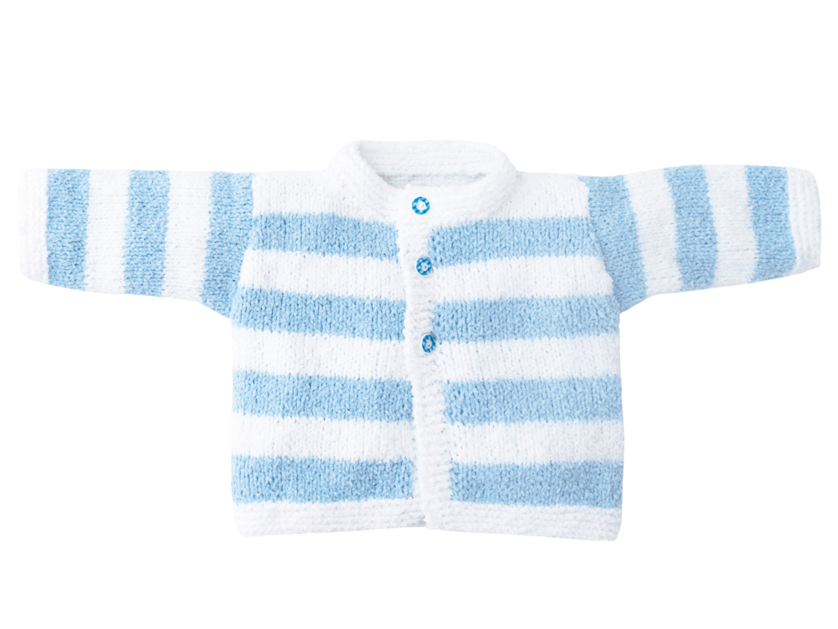 100 g of Lana Grossa Baby Soft (60% polyamide, 40% cotton; 150 m/50 g) in White (col 1) and 50 g in Light Blue (col 8). Size 4 mm needles; size 4 mm circular needle, 40 cm long; three 20 mm buttons
