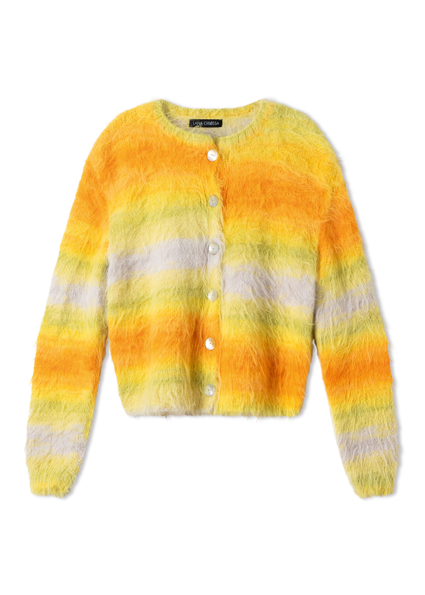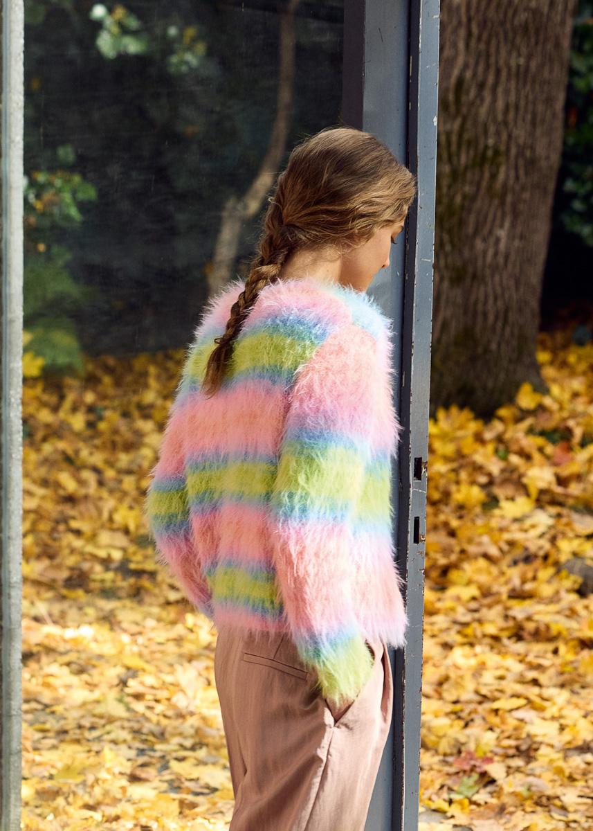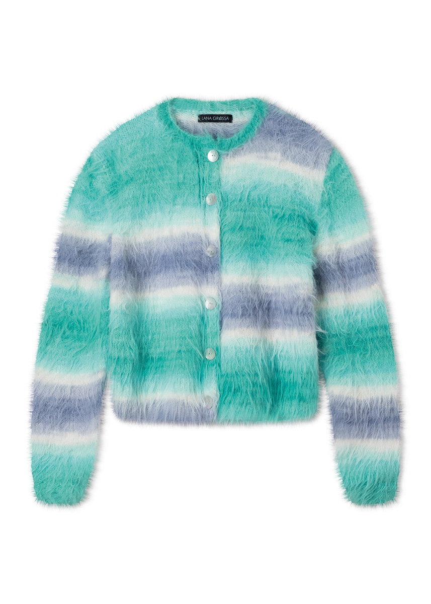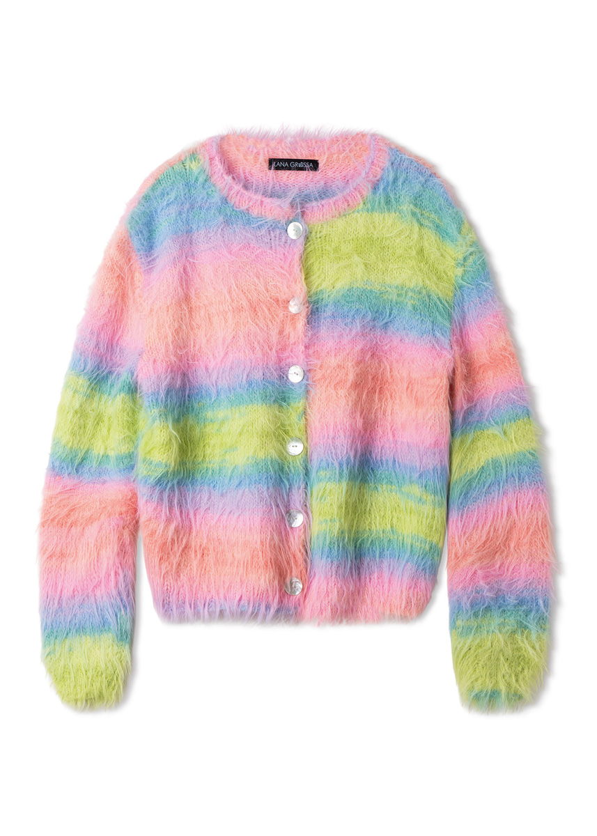 450 (500, 550, 600) g of Lana Grossa Basta Mista (50% Merino wool, 50% polyamide; 100 m/50 g) in Lime/Turquoise/ Aqua/Salmon/Pink/Lavender (col 113) or Off White/ Light Grey/Grey Blue/White Green/Turquoise/Mint Turquoise (col 116) or Greige/Vanilla/Yellow/Green Yellow/Sunflower/ Orange (col 114). Size 4 and 4.5 mm needles; short size 4 mm circular needle; six 20 mm mother-of-pearl buttons.