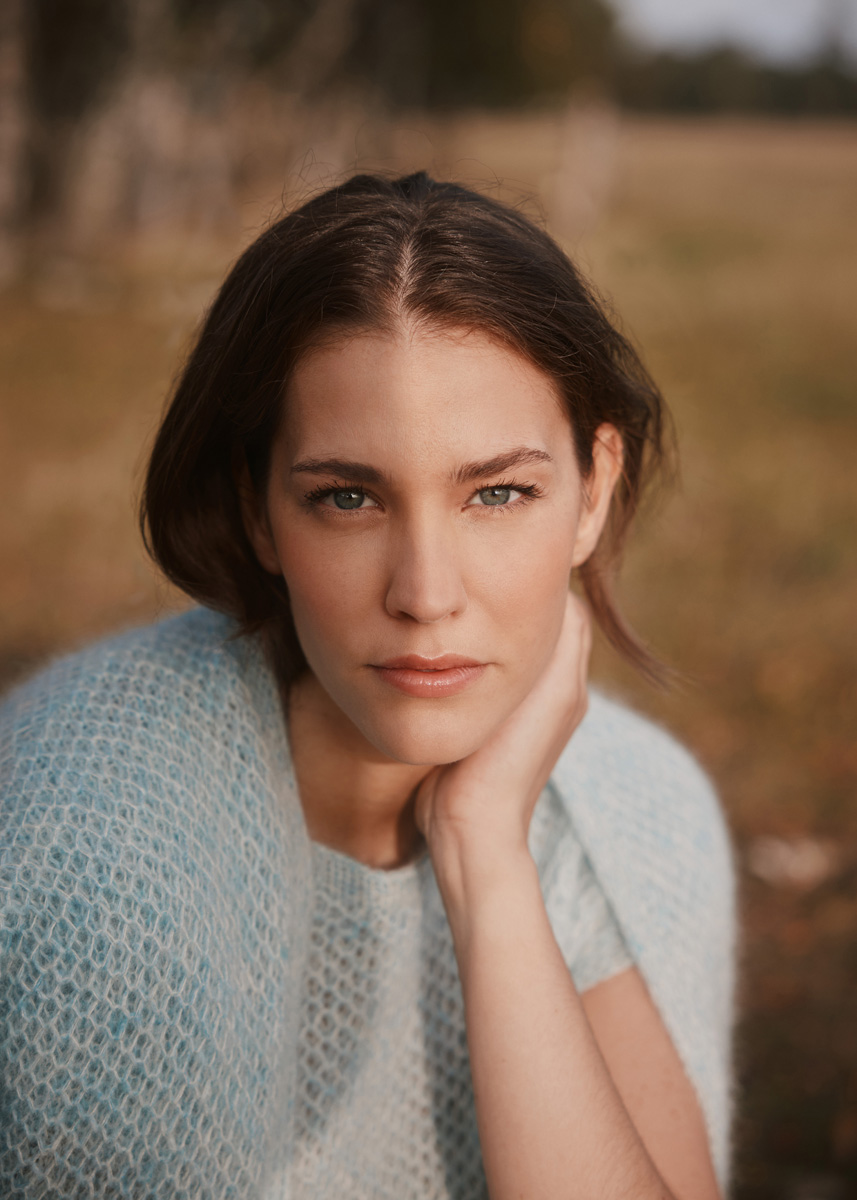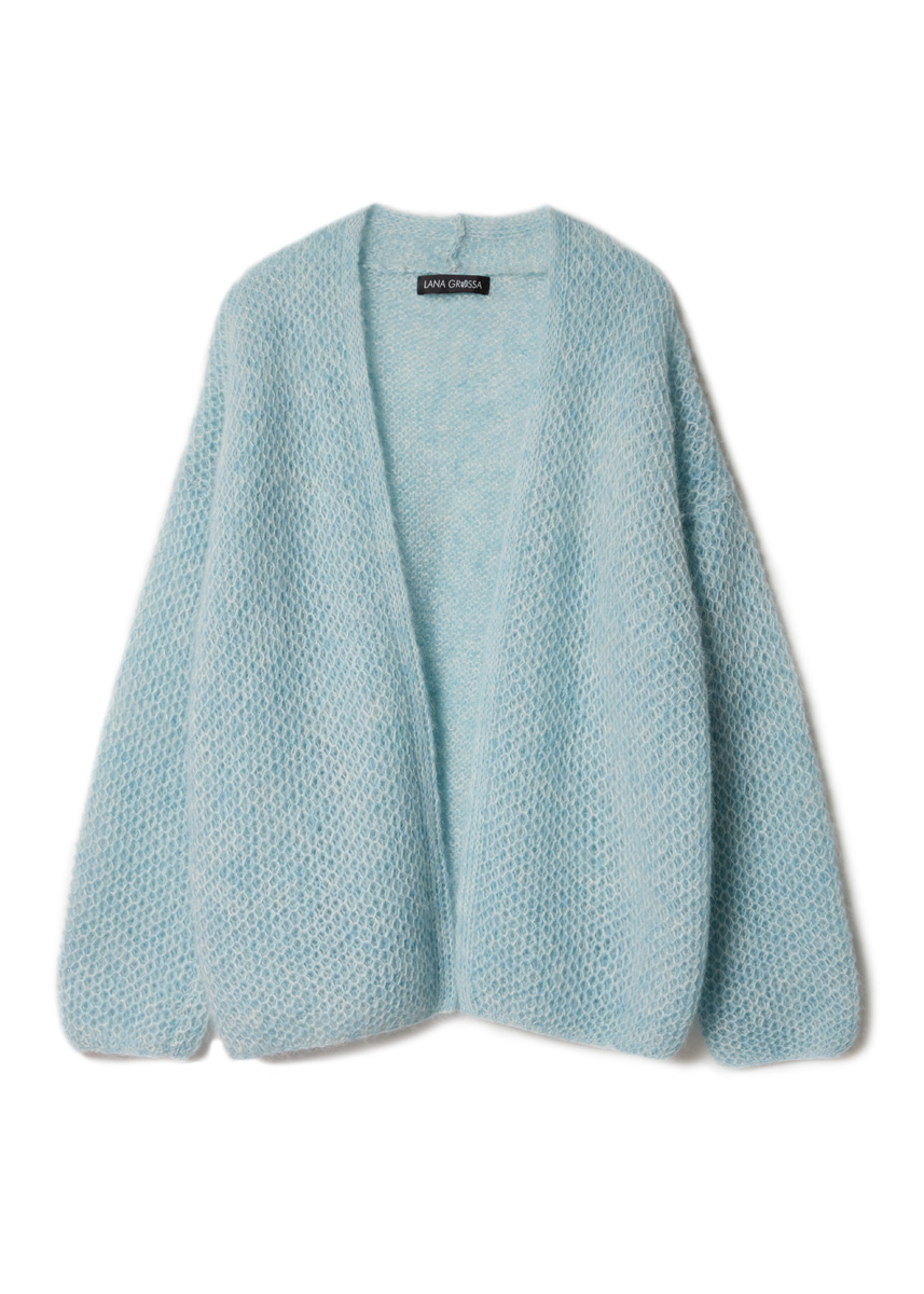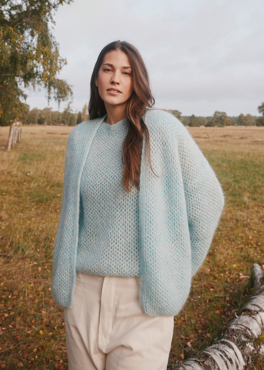 125 (150, 175, 200) g of Lana Grossa Bella (35% cotton, 30% nylon, 25% baby alpaca, 10% Merino wool; 250 m/25 g) in Aquamarine (col 22) and 150 (175, 200, 225) g of Lana Grossa Silkhair (70% superkid mohair, 30% silk; 210 m/25 g) in Off White (col 52). Size 4.5 mm needles.