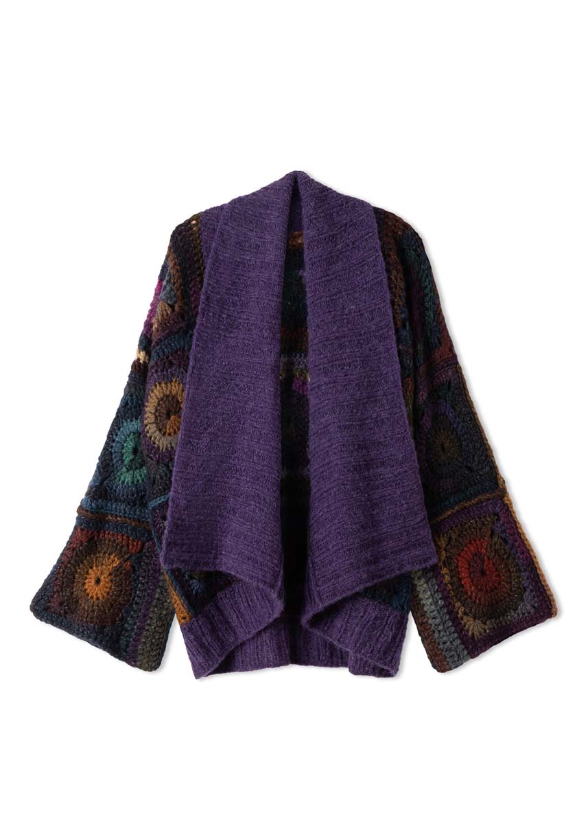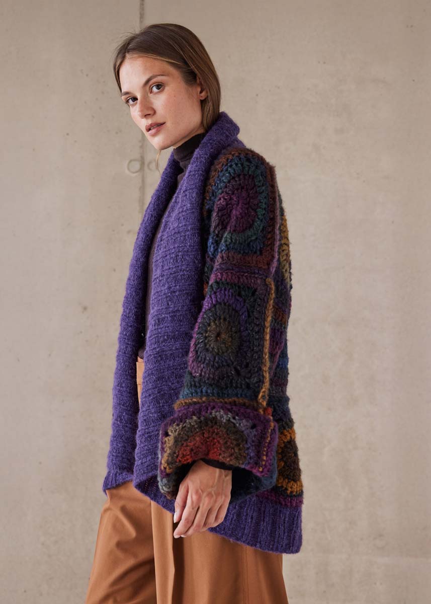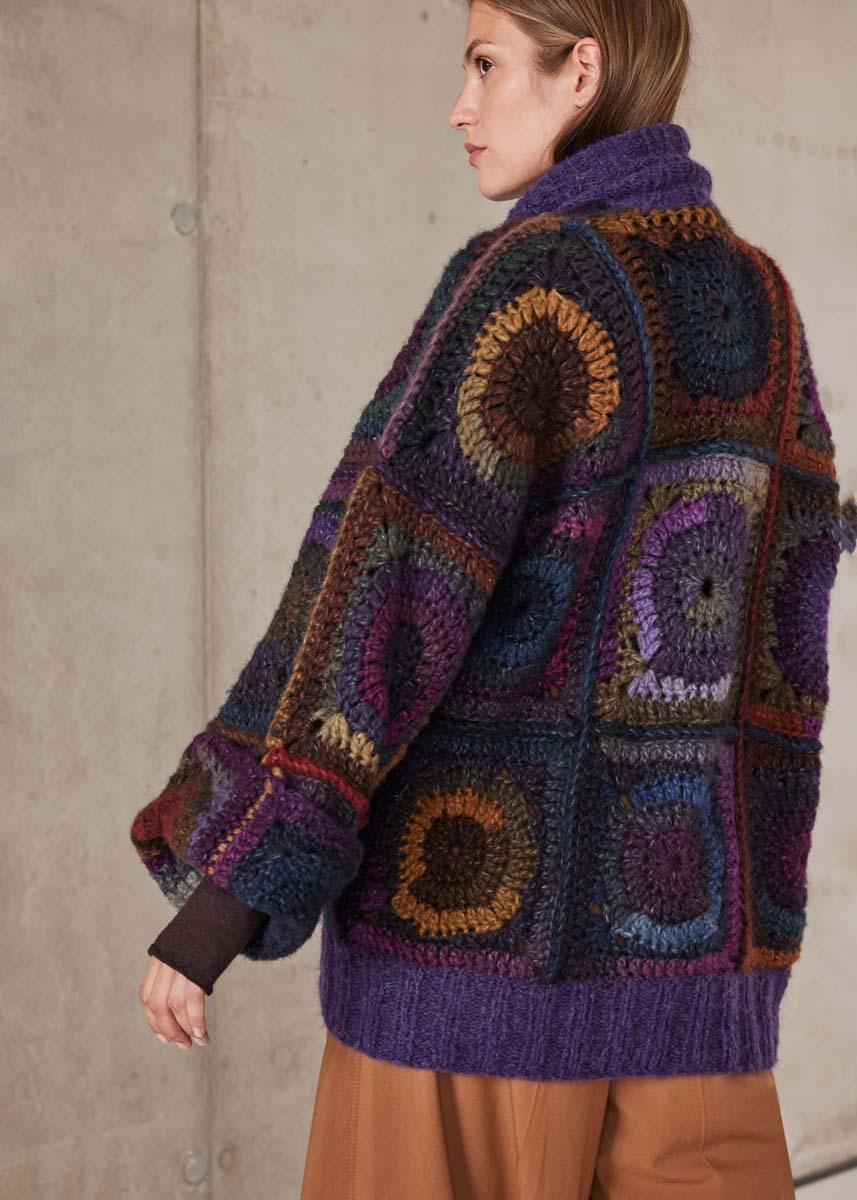 Lana Grossa Bomba (85 % Virgin wool Merino, 15 % Polyamide, 290 m/100 g), 400 g dark green/dark petrol/white green/gray green/citrus yellow/yellow/dark gray/corn yellow/salmon/coral/blackberry/dark violet/orange (col 4) and Lana Grossa Alpaca Air II (50 % Alpaca, 27 % Polyamide, 14 % Cotton, 9 % Virgin wool Merino, 140 m/50 g), 150 g dark violet (col 21); 1 crochet hook size 8 mm; 1 circular knitting needle size 6 mm, 100 cm long.