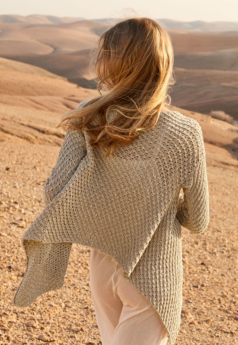 550 (600, 650) g of Lana Grossa Bottone (94% cotton, 6% polyamide; 120 m 50 g) in Beige (col 8). Size 6 and 6.5 mm circular needles, each 60 cm long