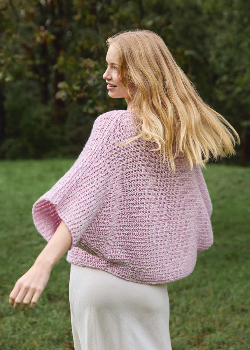 450 (500, 550) g of Lana Grossa Bottoni (53% cotton, 24% viscose, 23% extrafine Merino wool; 125 m/50 g) in Lilac/Off White (col 5); waste yarn for provisional cast-on; size 6 mm circular needle, 80 cm long.