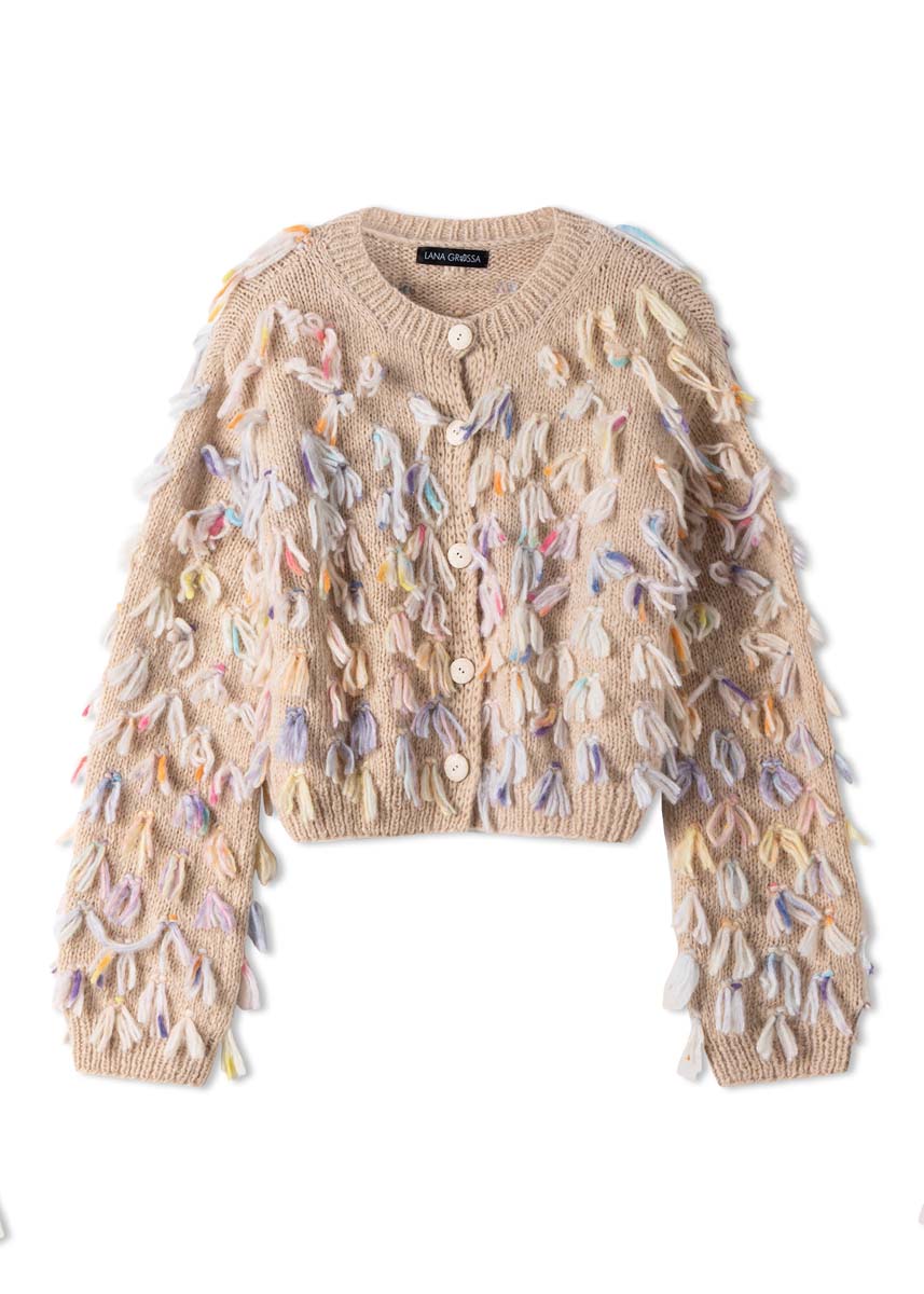 Lana Grossa Brigitte No. 2 (47 % Alpaca, 45 % Cotton, 8 % Virgin wool, 140 m/50 g), 350 (400 - 450) g light beige (col 47) and Lana Grossa Cassata (54 % Virgin wool Merino, 30 % Polyamide, 16 % Cotton, 175 m/50 g), 100 g raw white/orange/purple/light blue/yellow (col 8); knitting needles size 5 mm and 6 mm; 1 circular knitting needle size 5 mm, 60 cm long; 5 beige buttons, 25 mm Ø.