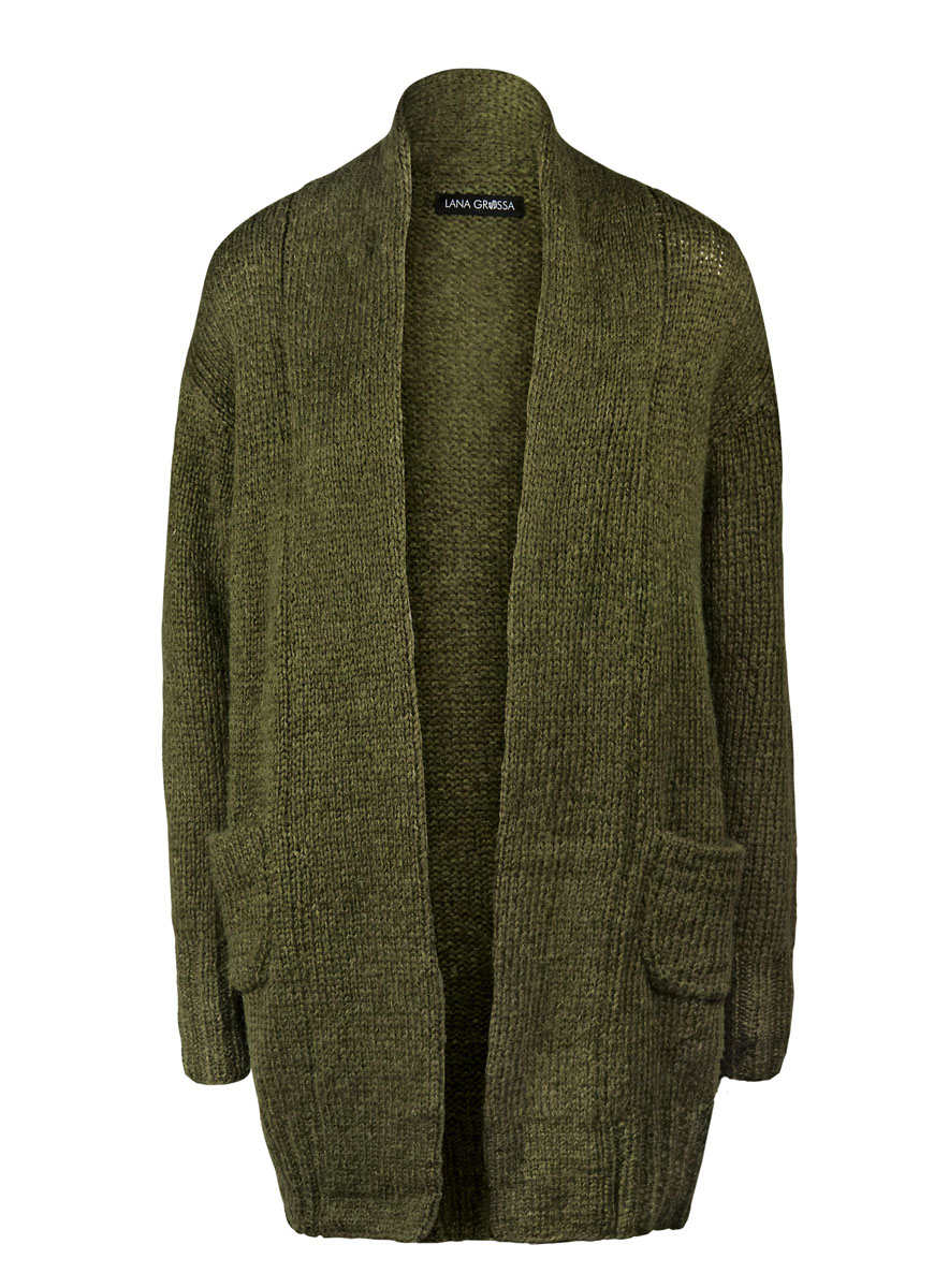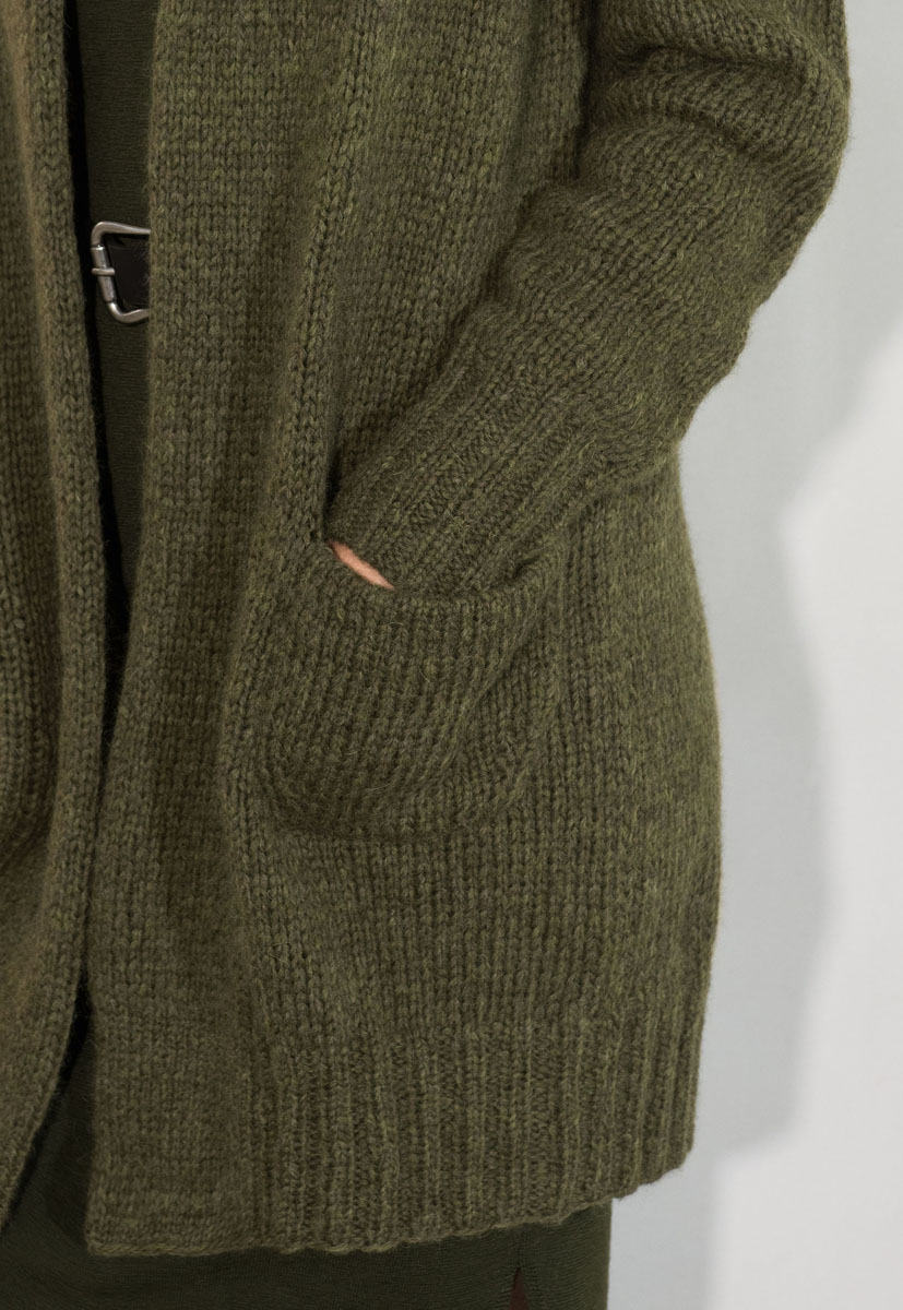 400 (450, 500) g of Lana Grossa Brigitte No. 2 (47% alpaca, 45% cotton, 8% pure wool; 140 m/50 g) in Khaki (col 2). Size 4, 5 and 7 mm needles