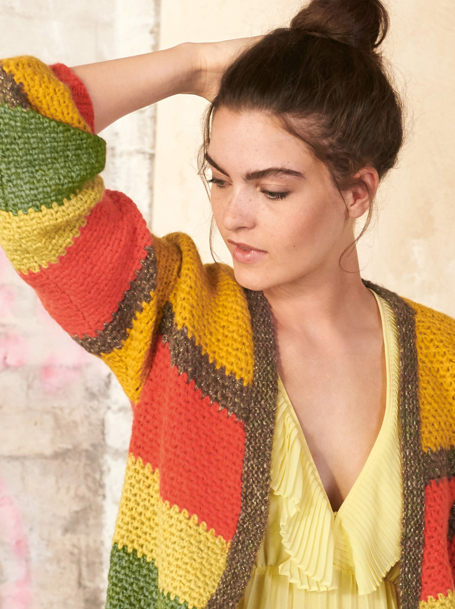 100 (150, 200) g each of Lana Grossa Brigitte No. 2 (47% baby alpaca, 45% cotton, 8% Merino wool; 140 m/50 g) in Green (col 1), Green/Yellow (col 17), Corn (col 21) and Coral (col 25); 50 (100, 100) g of Lana Grossa Lala Berlin Shiny (46% baby alpaca, 30% cotton, 8% Merino wool, 8% polyester, 8% polyamide; 150 m/50 g) in Khaki/Brown (col 12). Size 6 mm crochet hook; size 5 mm circular needle, 120 cm long; one set size 5 mm double-pointed needles [dpns]