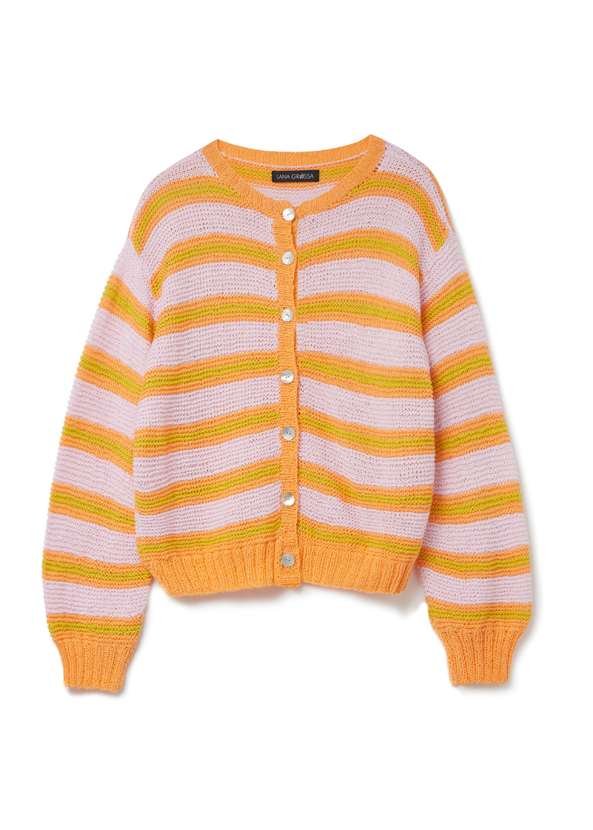 200 (250, 250) g of Lana Grossa Campo (65% cotton, 25% viscose, 10% linen; 165 m/50 g) in Orange (col 14), 150 (200, 200) g in Rosé (col 21) and 50 (100, 100) g in Daffodil (col 12). Size 3 and 3.5 mm needles; size 3 mm circular needle, 80 cm long; seven 18 mm mother-ofpearl buttons [by Union Knopf, item 46286, col 14].