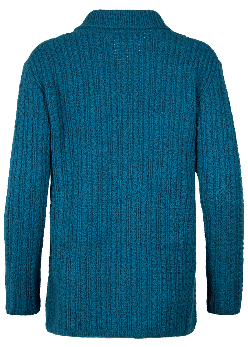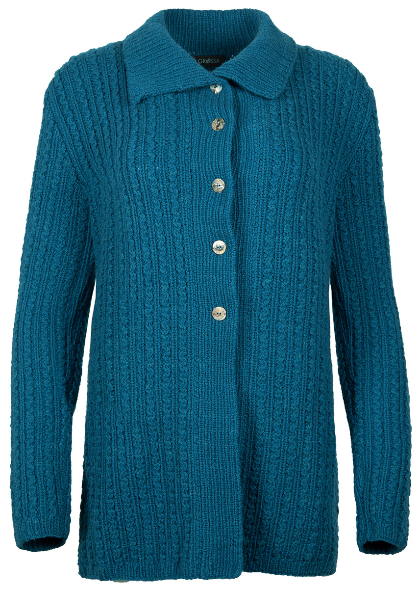 500 (550, 600) g of Lana Grossa Cashmere Moda (65% Merino wool, 25% cashmere, 10% polyester; 90 m/25 g) in Dark Petrol (col 2). Size 6 mm needles; size 6 mm circular needle, 40 cm long; five 18 mm buttons [by UNION KNOPF, item 37604, col 12]