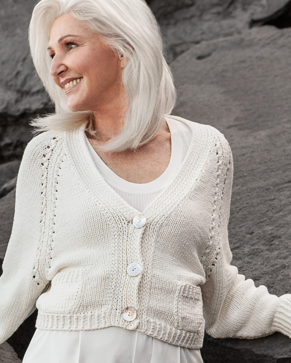 500 g of Lana Grossa Cashseta (40% Modal, 30% polyamide; 15% cashmere, 15% silk; 100 m/50 g) in Natural (col 8). Size 5 and 7 mm needles; three 28 mm mother- of-pearl buttons in white