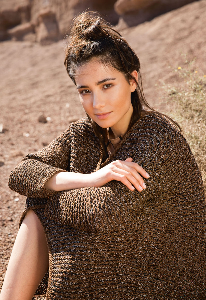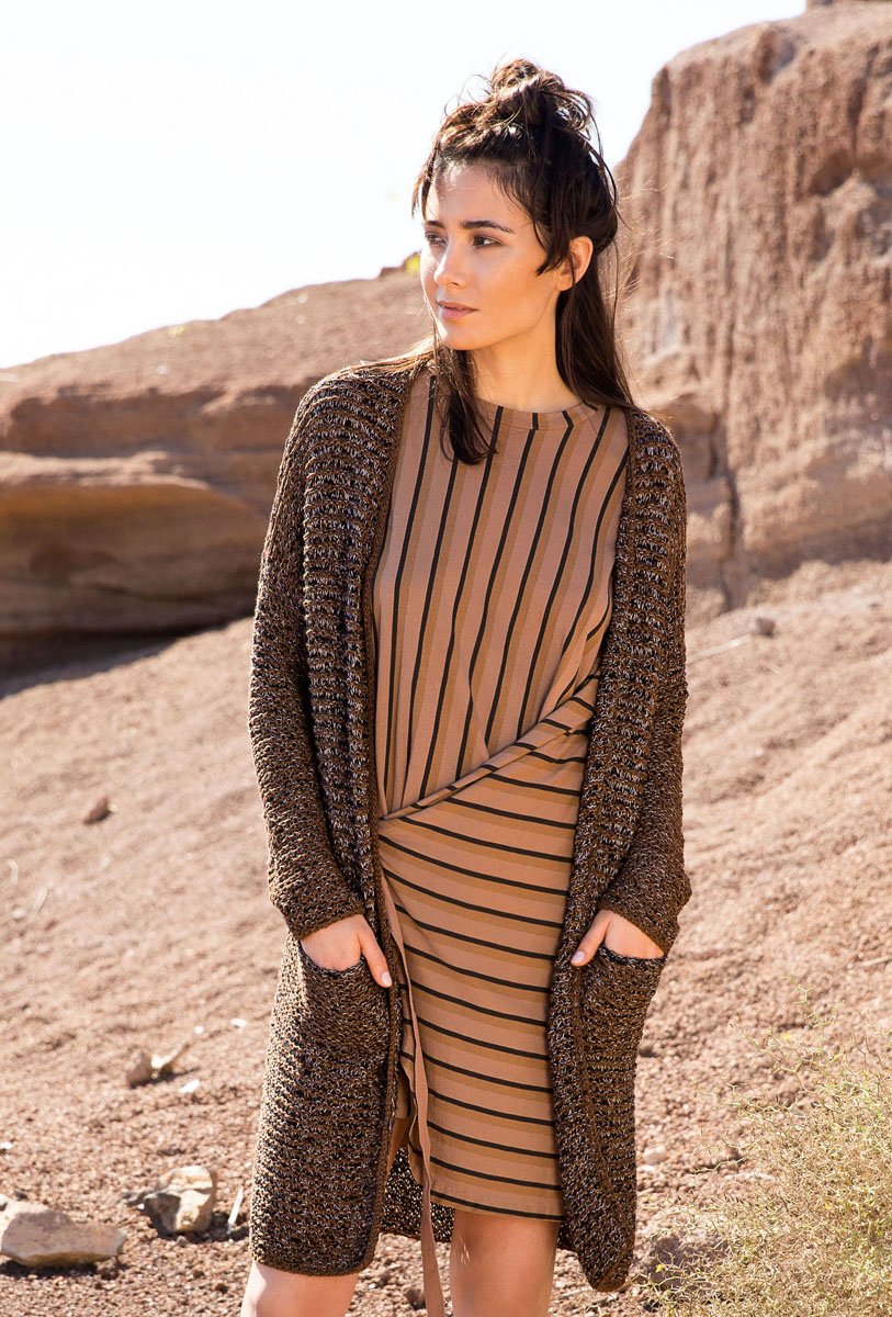 linen; 105 m/50 g) in Dark Brown Melange (col 117). Size 5 mm needles; size 4.5 mm circular needles, 60 and 120 cm long
