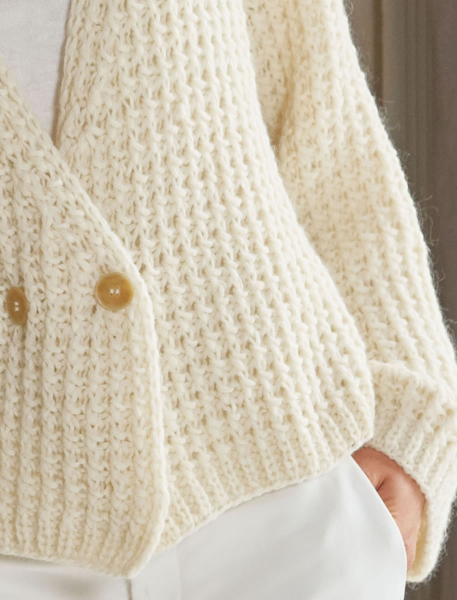 500 (550, 600) g of Lana Grossa Colmo (55% Merino wool, 25% baby alpaca, 20% superkid mohair; 120 m/50 g) in Natural (col 1). Size 6 and 8 mm needles; two 25 mm buttons in natural [by Union Knopf, item 452261, col 16].