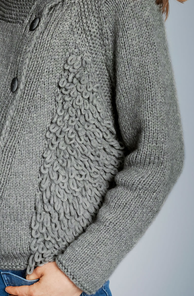 450 (500) g of Lana Grossa Colmo (55% Merino wool, 25% baby alpaca, 20% superkid mohair; 120 m/50 g) in Dark Grey (col 3). Size 7 mm needles; size 7 mm circular needle, 60 cm long; five 25 mm buttons in light-/dark grey [by Union Knopf, item 452593, col 76].