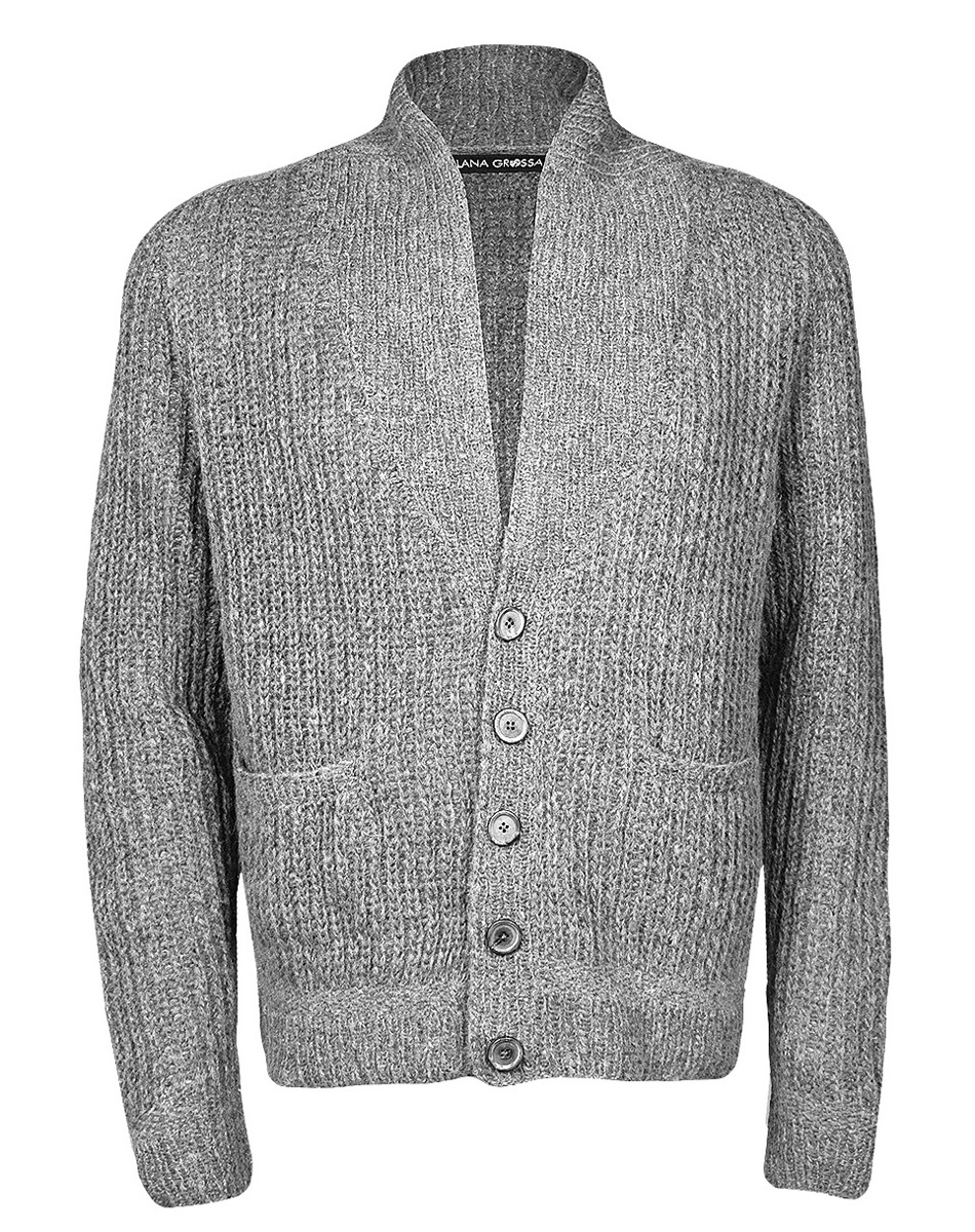 350 (400, 450) g of Lana Grossa Cool Air Fine (50% Merino wool, 28% baby alpaca, 22% acrylic; 240 m/50 g) in Jeans (col 4). Size 3 and 4 mm needles; five 23 mm buttons [by Union Knopf, item 453185, col 16]
