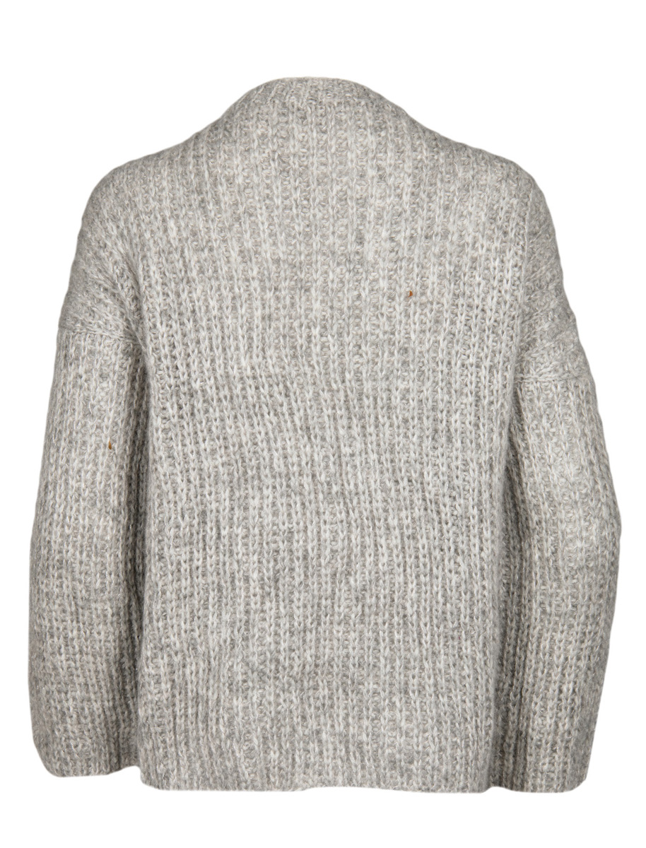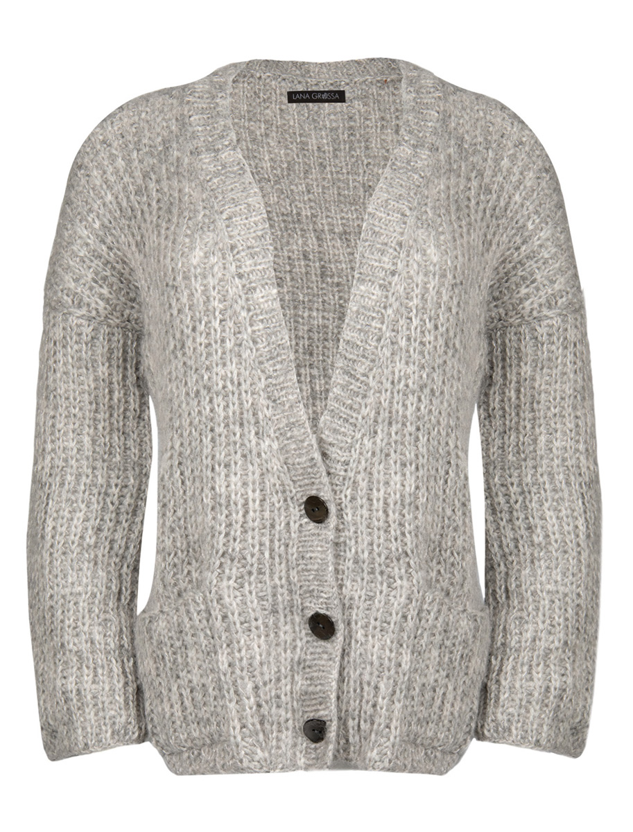 250 (300, 350) g of Lana Grossa Cool Air Fine (50 % pure wool, 28 % alpaca, 22 % acrylic; 240 m / 50 g) in Grey / Natural (col 12) and 125 (150, 175) g of Lana Grossa Silkhair Lusso (78 % superkid mohair, 14 % silk, 4 % polyester, 4 % polyamide; 210 m / 25 g) in Pale Pink (col 901). Size 4.5 mm needles; size 4.5 mm circular needle, 80 cm long; three 24 mm buttons