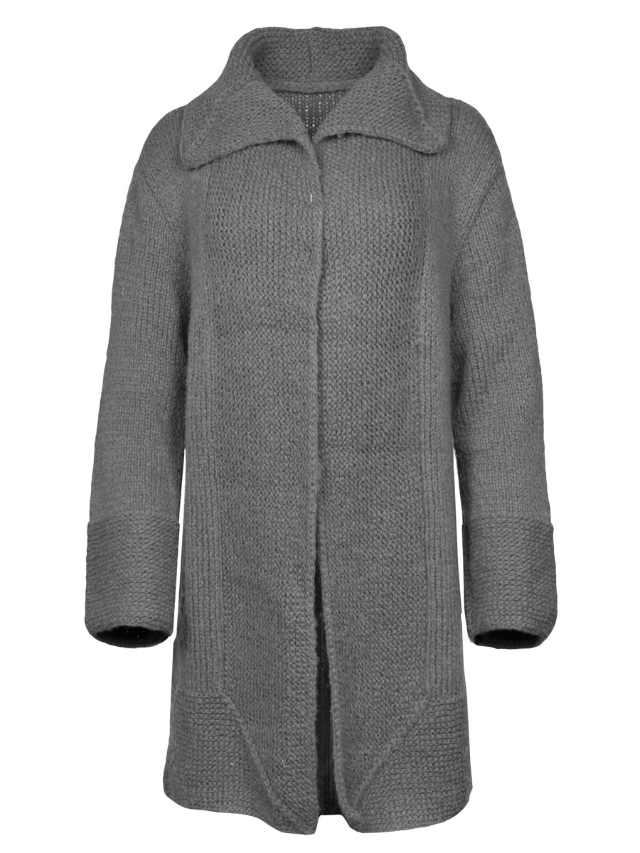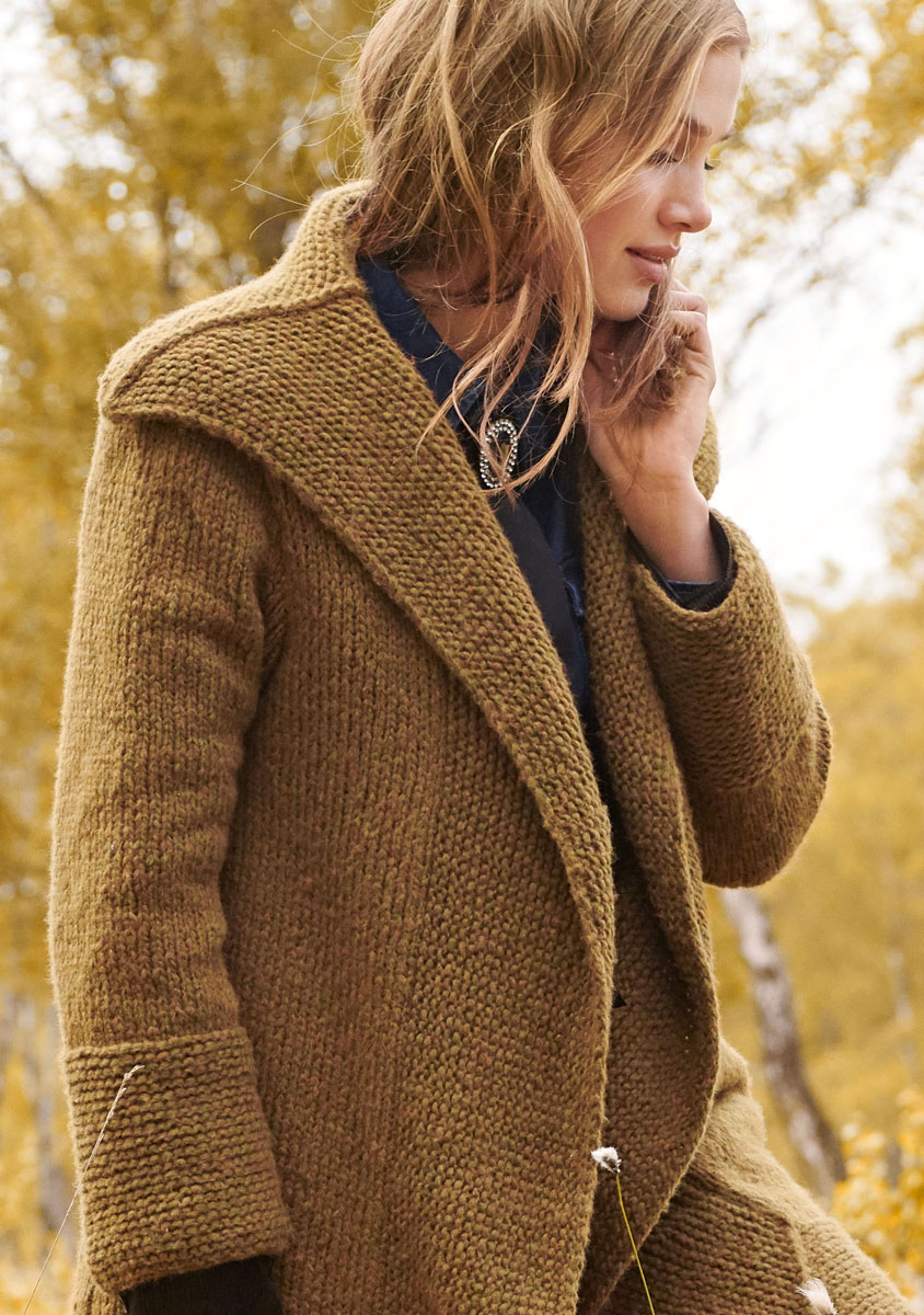 700 (750, 800) g of Lana Grossa Cool Air (55% Merino wool, 33% baby alpaca, 12% polyamide; 125 m/50 g) in Ochre Brown (col 14). Size 6 mm needles; size 6 mm circular needle, 120 cm long