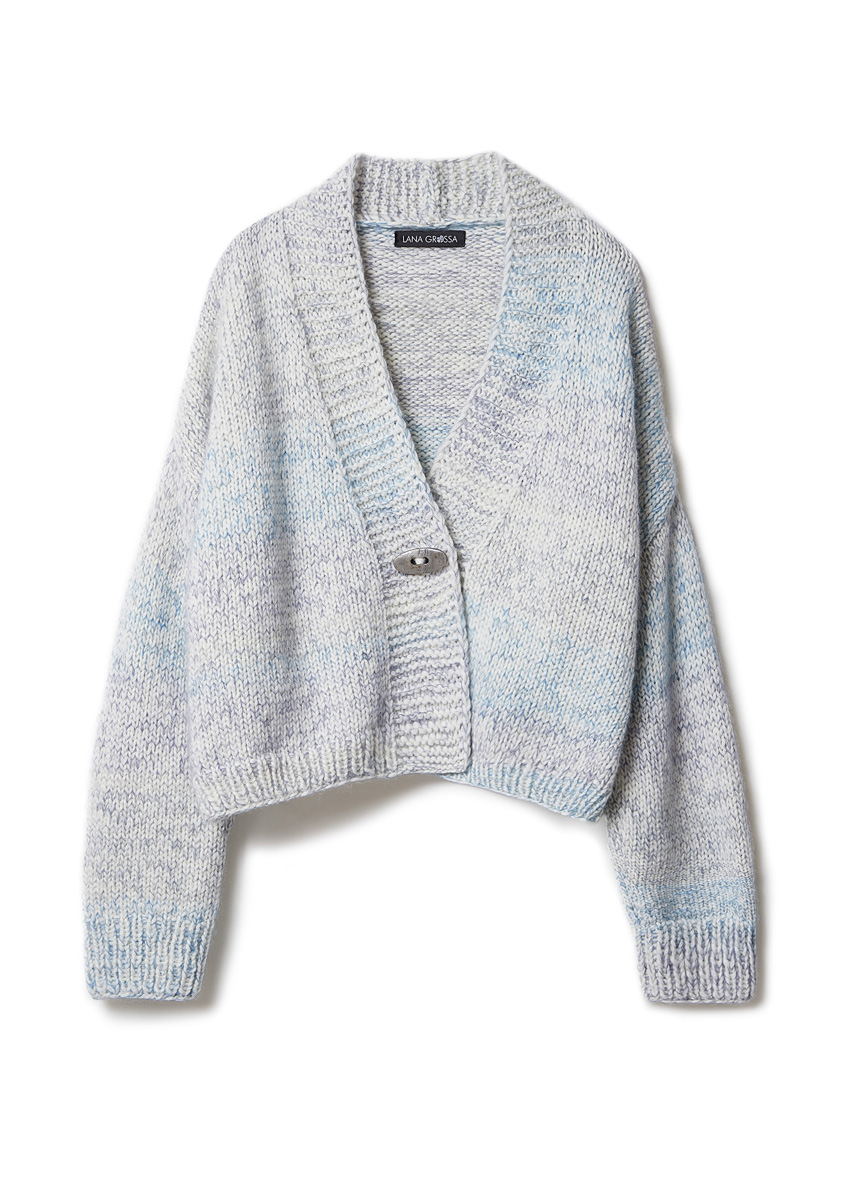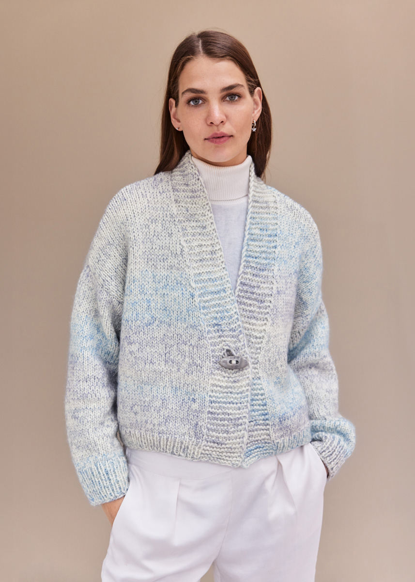 500 (550, 600, 650, 700) g of Lana Grossa Cool Merino Big (90% Merino wool, 10% polyamide; 90 m/50 g) in Off White (col 201) and 100 (125, 125, 150, 150) g of Lana Grossa Silkhair Print (70% superkid mohair, 30% silk; 210 m/25 g) in Light Grey/Grey Purple/Jeans/Grey Blue (col 431). Size 5.5 and 7 mm needles; one 50 mm toggle button [by Union Knopf, item 837244].