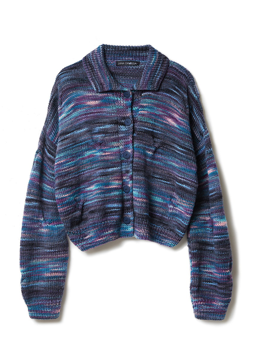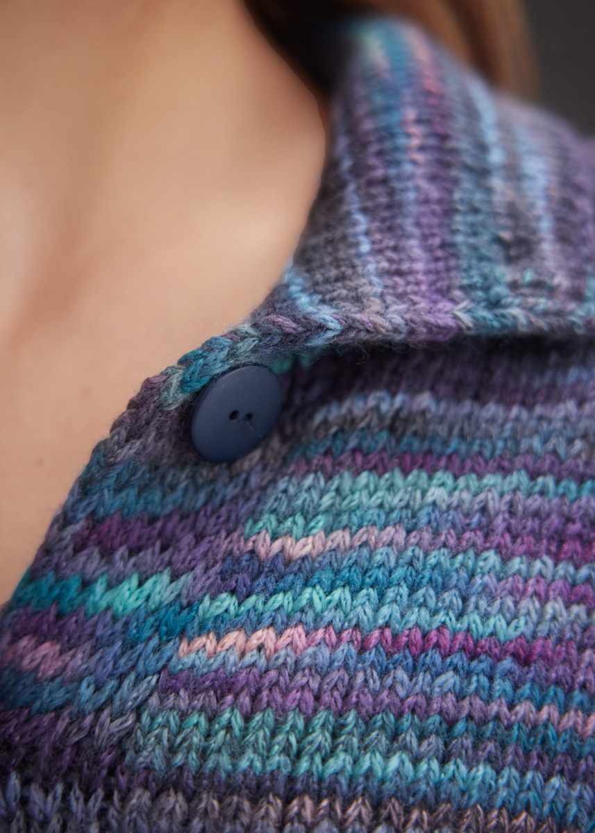 400 (450, 450, 500) g of Lana Grossa Cool Merino Color (90% Merino wool, 10% polyamide; 150 m/50 g) in Grey Violet/Petrol/Sea Green/Pink/Red Violet/Black Green/ Black/Jeans (col 318). Size 4 and 6 mm needles; short size 4 mm circular needle; cable needle [cn]; six 23 mm buttons in dark blue [by Union Knopf, item 0028450].