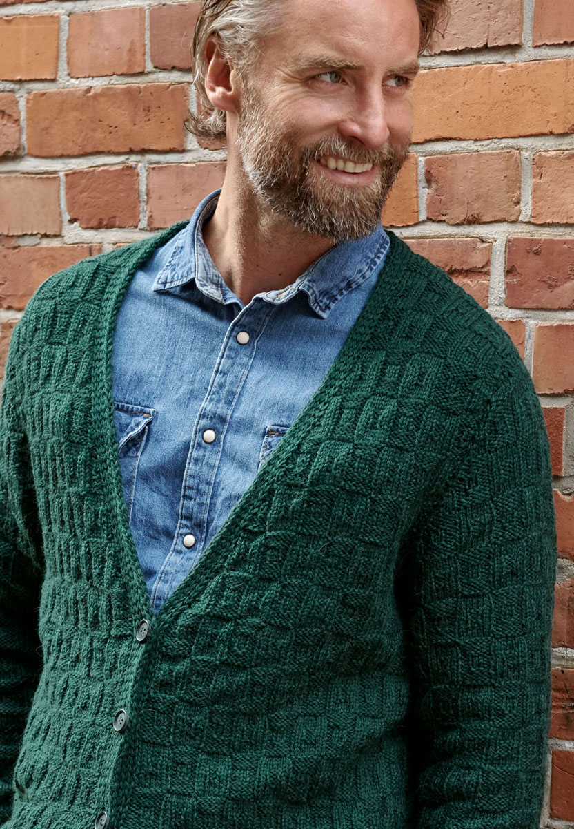 600 (650, 700) g of Lana Grossa Cool Wool Alpaca (70% Merino wool, 30% baby alpaca; 140 m/50 g) in Dark Green (col 34). Size 3.5 and 4.5 mm needles; five 20 mm buttons [by Union Knopf, item 36428, col 80]