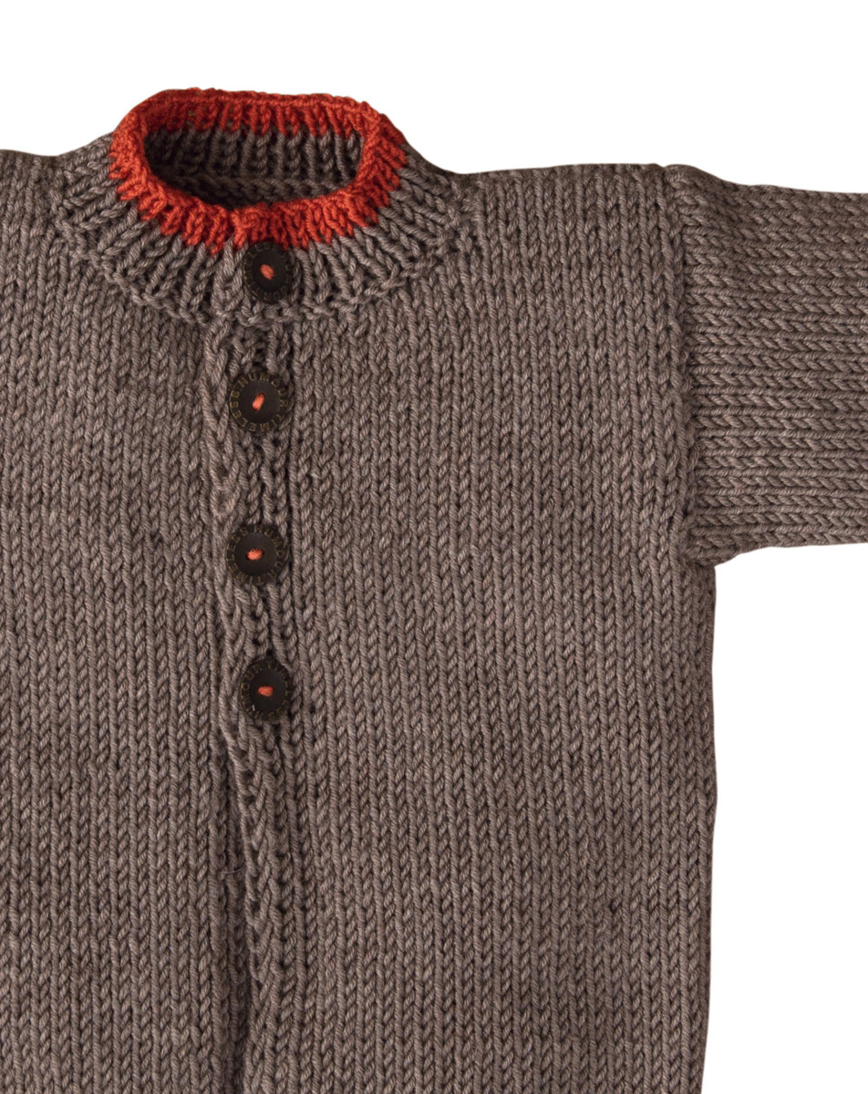 150 g of Lana Grossa Cool Wool Big Mélange (100% pure wool; 120 m/50 g) in Grey/Brown Mélange (col 315) and 50 g of Lana Grossa Cool Wool Baby (100% pure wool; 220 m/50 g) in Tomato (col 271). Size 4 mm needles; size 4 mm circular needle, 40 cm long; four 15 mm buttons