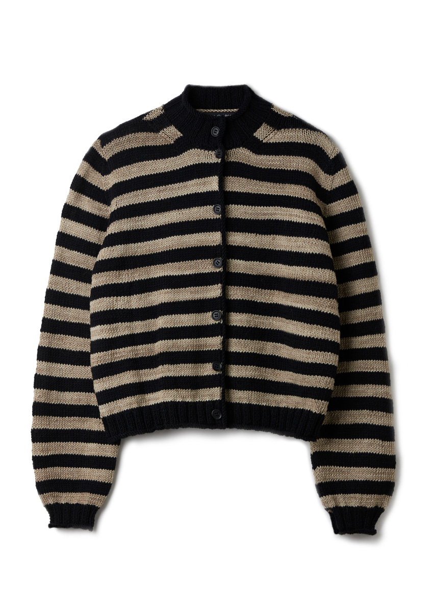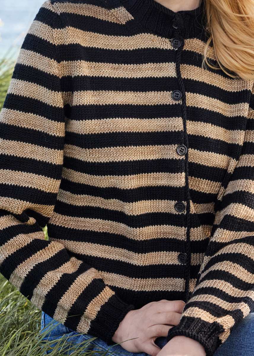 300 (350, 350) g of Lana Grossa Cool Wool Big (100% Merino wool; 120 m/50 g) in Black (col 627); 200 (250, 300) g of Lana Grossa Cool Wool Big Vintage (100% Merino wool; 120 m/50 g) in Sand (col 7182). Size 3.5 and 4 mm circular needles, each 60 – 80 cm long; seven 16 mm buttons.