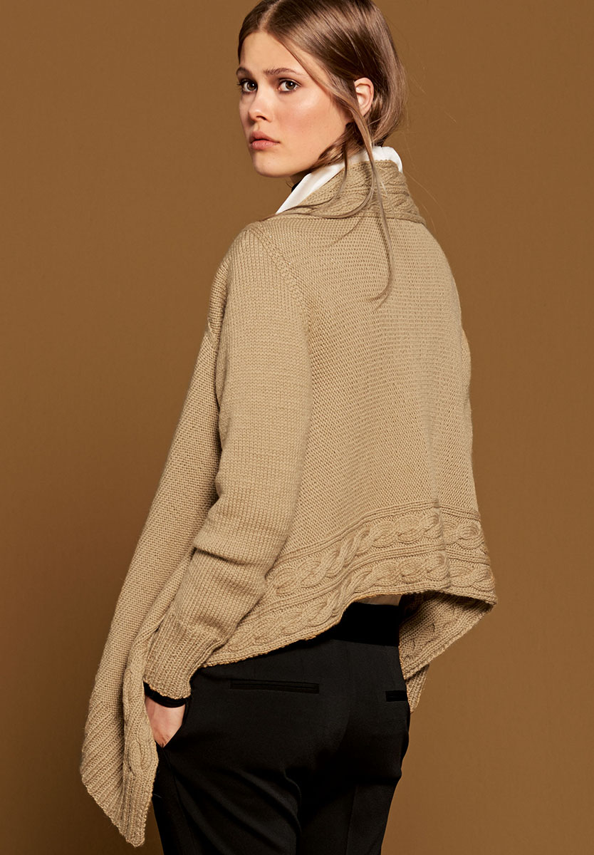 550 (600) g of Lana Grossa Cool Wool Big (100% pure wool; 120 m/50 g) in Sand (col 685). Size 4 and 4.5 mm needles; cable needle [cn].