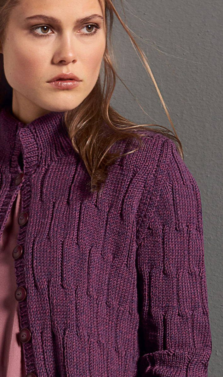 650 (700, 750) g of Lana Grossa Cool Wool Big Melange (100% pure wool; 120 m/50 g) in Bordeaux/Heathered Dark Grey (col 337). Size 4 and 4.5 mm needles; size 4 mm circular needle; ten 20 mm buttons [by UNION KNOPF, item 452 118, col 58].