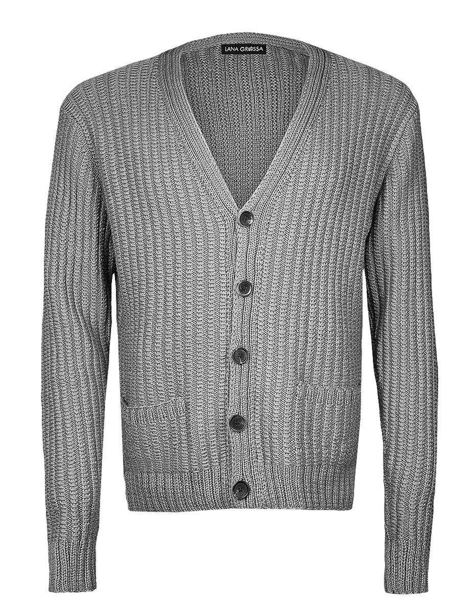 550 (600, 650) g of Lana Grossa Cool Wool Cashmere (90% Merino wool, 10% cashmere; 160 m/50 g) in Grey/Green (col 33). Size 3.5 needles; five 22 mm buttons in brown [by Union Knopf, item 36428]