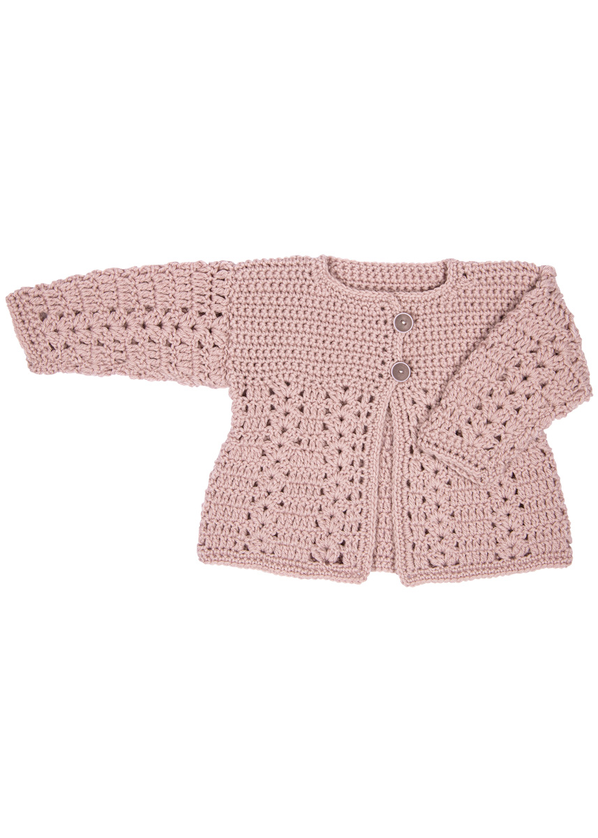100 g of Lana Grossa Cool Wool Cashmere (90% Merino wool, 10% cashmere; 160 m/50 g) in Pastel Pink (col 17). Size 4 mm crochet hook; two 15 mm buttons