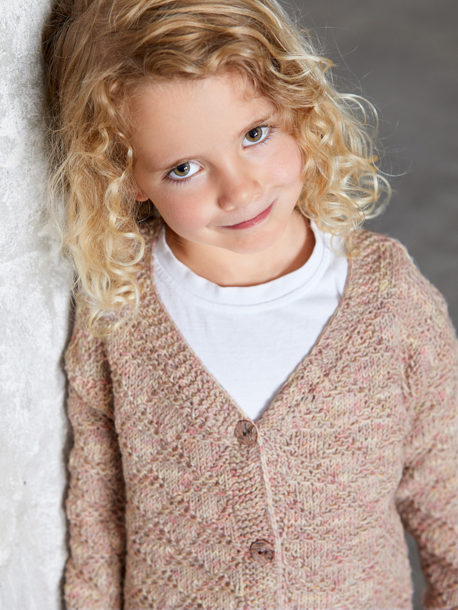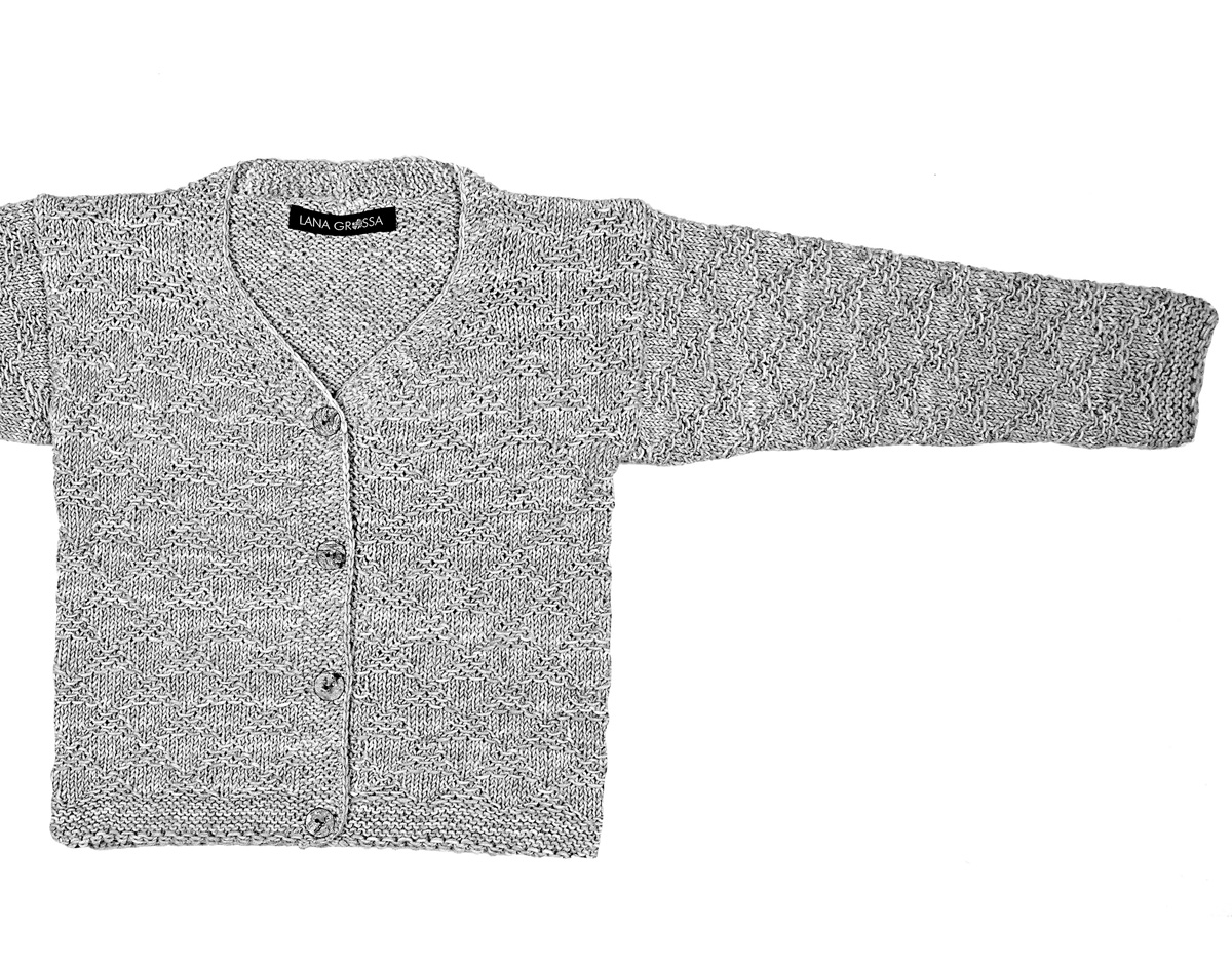 300 (300, 350) g of Lana Grossa Cool Wool Semi Solid (100% pure wool; 160 m/50 g) in Pink/Salmon/ Pale Grey Mélange (col 6512). Size 4.5 mm needles; size 4.5 mm circular needle, 40 cm long; size 3.5 mm crochet hook; four 18 mm buttons in red [by Union Knopf, item 452665]
