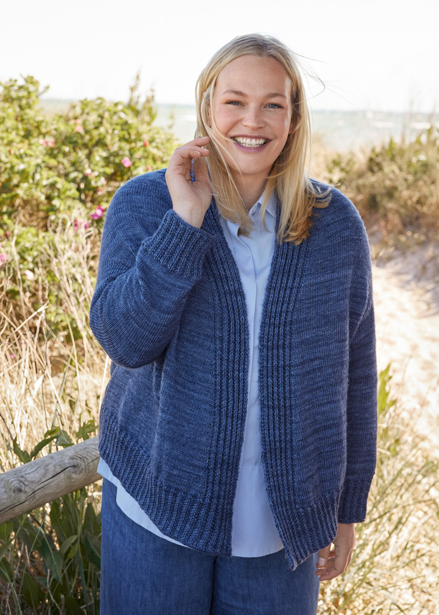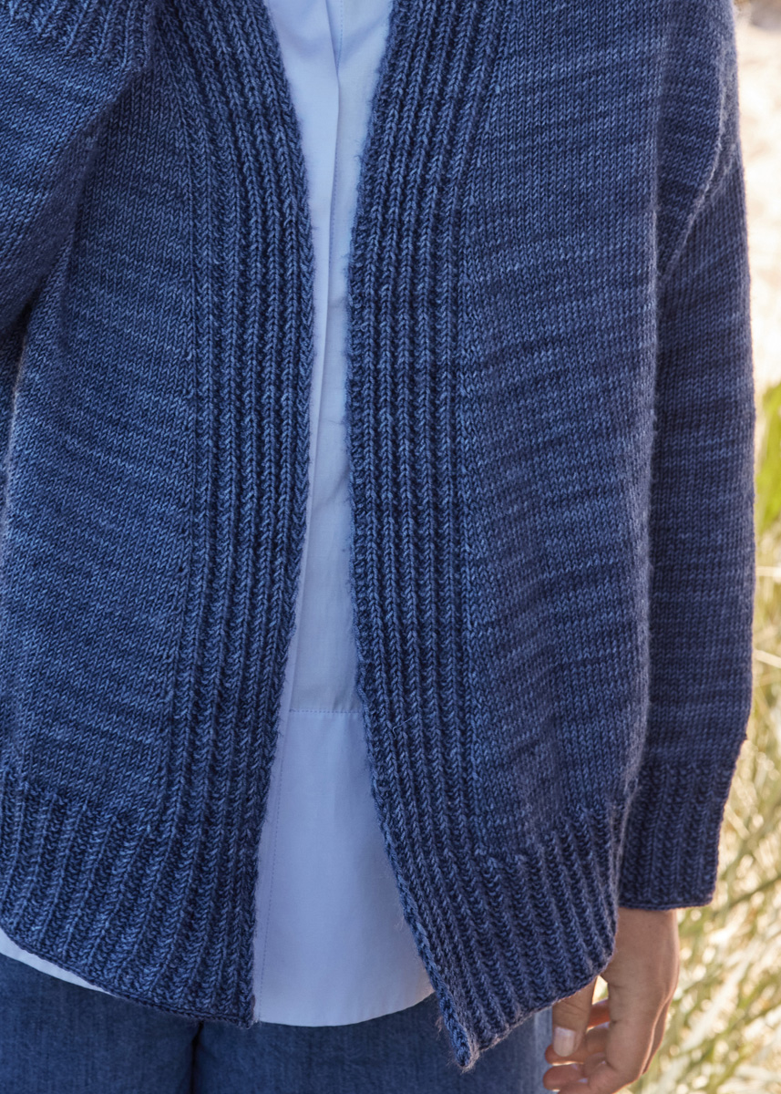 500 (550, 600) g of Lana Grossa Cool Wool Vintage (100% extrafine Merino wool; 160 m/50 g) in Dark Blue (col 7366). Size 3.5 mm circular needles, 60, 80 and 120 cm long; one set size 3.5 mm double-pointed needles [dpns]; stitch markers, stitch holders; smooth waste yarn.