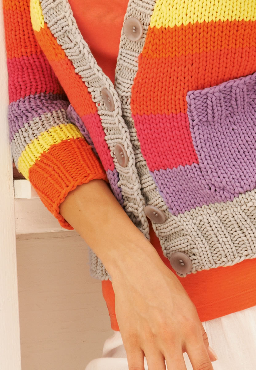 Lana Grossa Cotofine (70% cotton, 30% polyamide, RL approx. 99yd/90m/50 g/1 ball) 100 (150) g/2 (3) balls each in red (col 21), beige (col 13) and pink (col 4); approx. 50 (100) g/1 (2) balls each in grège (col 14), yellow (col 10), orange (col 2) and purple (col 5); size 10½ and 11 [6.5 and 8mm] needles, size 10½ [6.5mm] circular needle; five 1” buttons in beige [by Union Knopf, item 450761].
