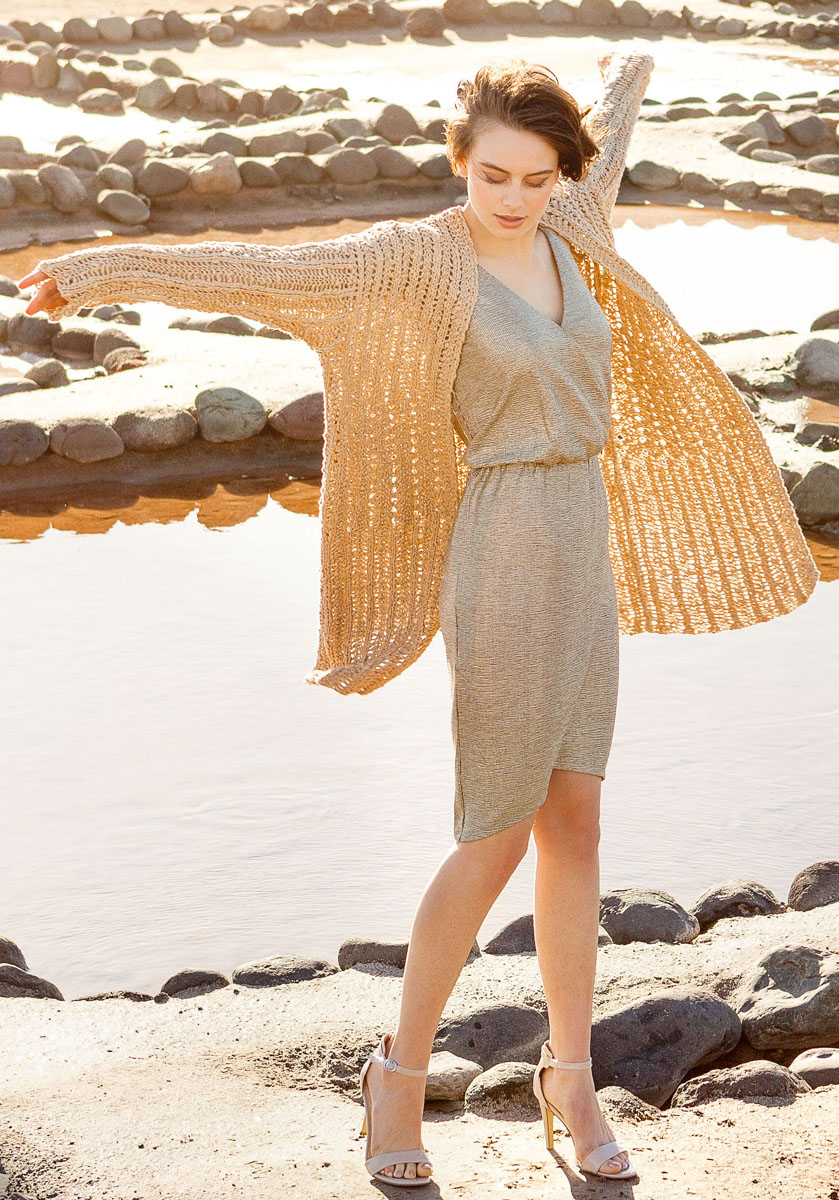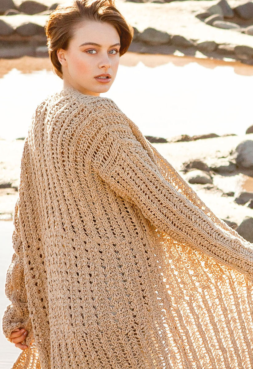 950 (1000) g of Lana Grossa Cotton Style (100% cotton; 80 m//50 g) in Camel (col 3). Size 6.5 mm needles; size 5 mm crochet hook
