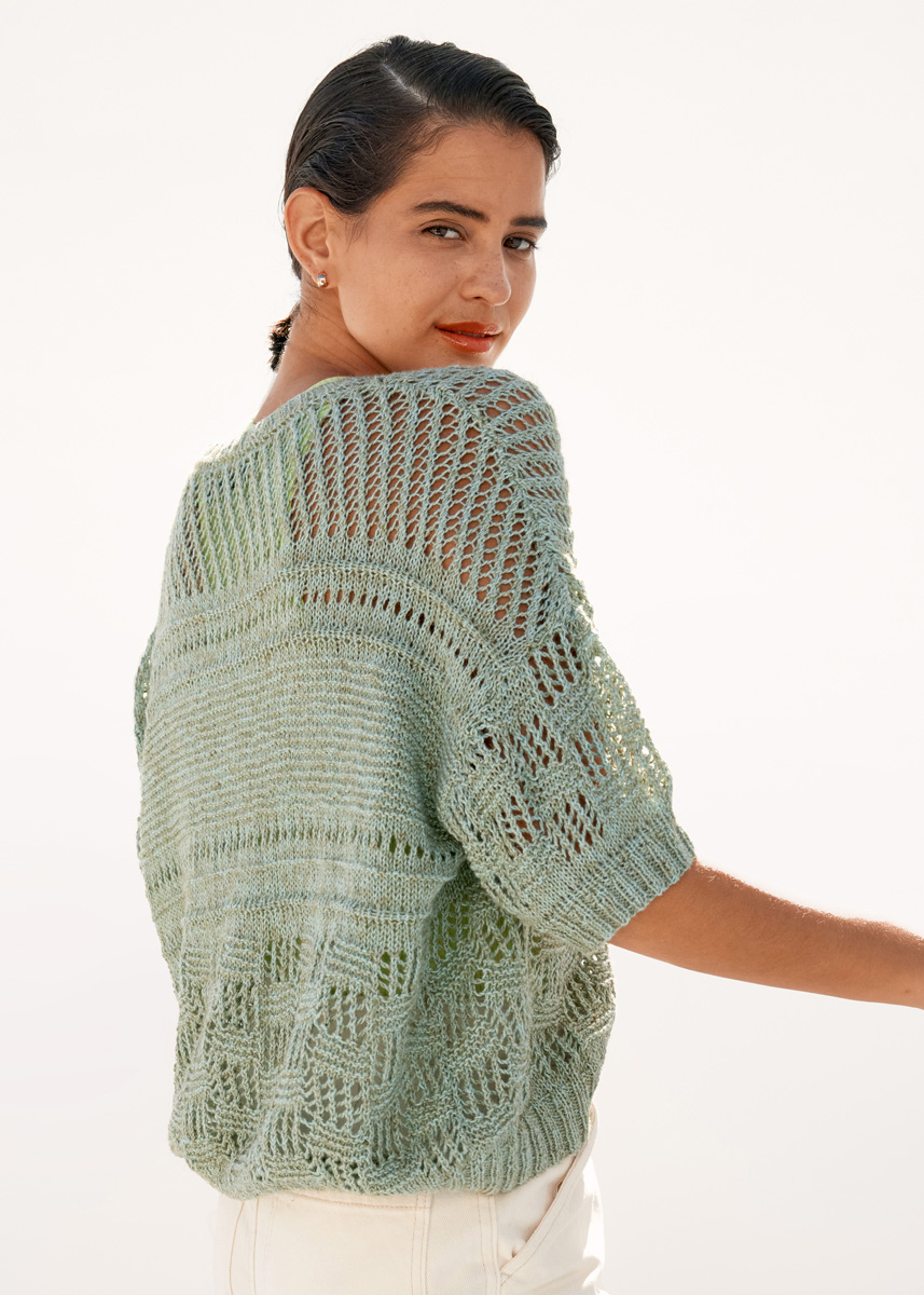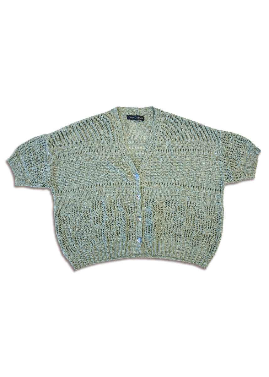 250 (300) g of Lana Grossa Diversa (74% cotton, 26% viscose; 210 m/50 g) in Mint (col 9). Size 3 and 4.5 mm needles; size 3 mm circular needle, 120 cm long; four 18 mm mother-of-pearl buttons [by Union Knopf, item 46286, col 76].