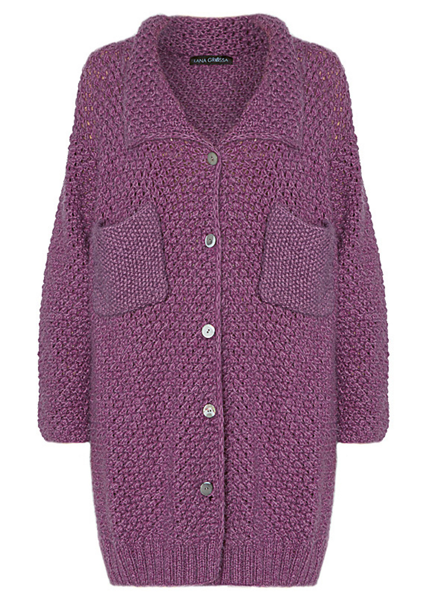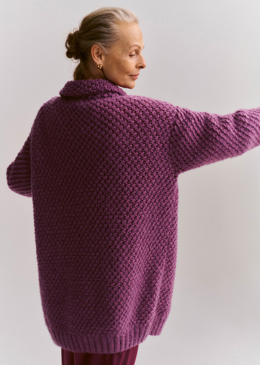 450 (500) g of Lana Grossa Ecopuno (72% cotton, 17% Merino wool, 11% baby alpaca; 215 m/50 g) in Berry (col 40) and 500 (550) g of Lana Grossa Per Fortuna (74% organic cotton, 26% polyamide; 190 m/50 g) in Violet (col 4). Size 5 and 7 mm needles; size 5 and 7 mm circular needles, each 80 cm long; five 20 mm buttons in light grey