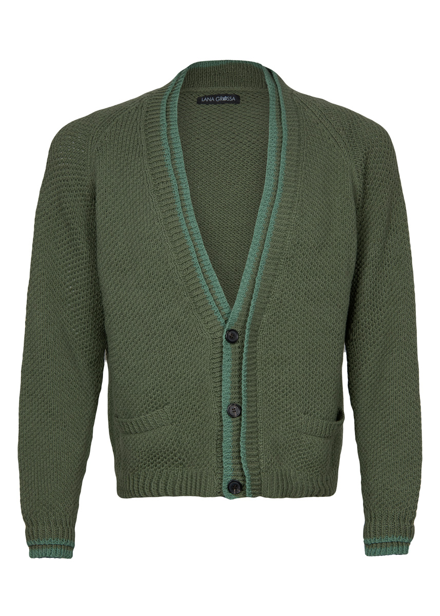 600 (650, 700) g of Lana Grossa Elastico (96% cotton, 4% polyester; 160 m/50 g) in Oleander Green (col 156) and 50 g in Reseda Green (col 141). Size 3.5 mm needles; two size 3.5 mm circular needles, each 80 cm long; spare needle; three 20 mm buttons in brown [by UNION KNOPF, item 36428].