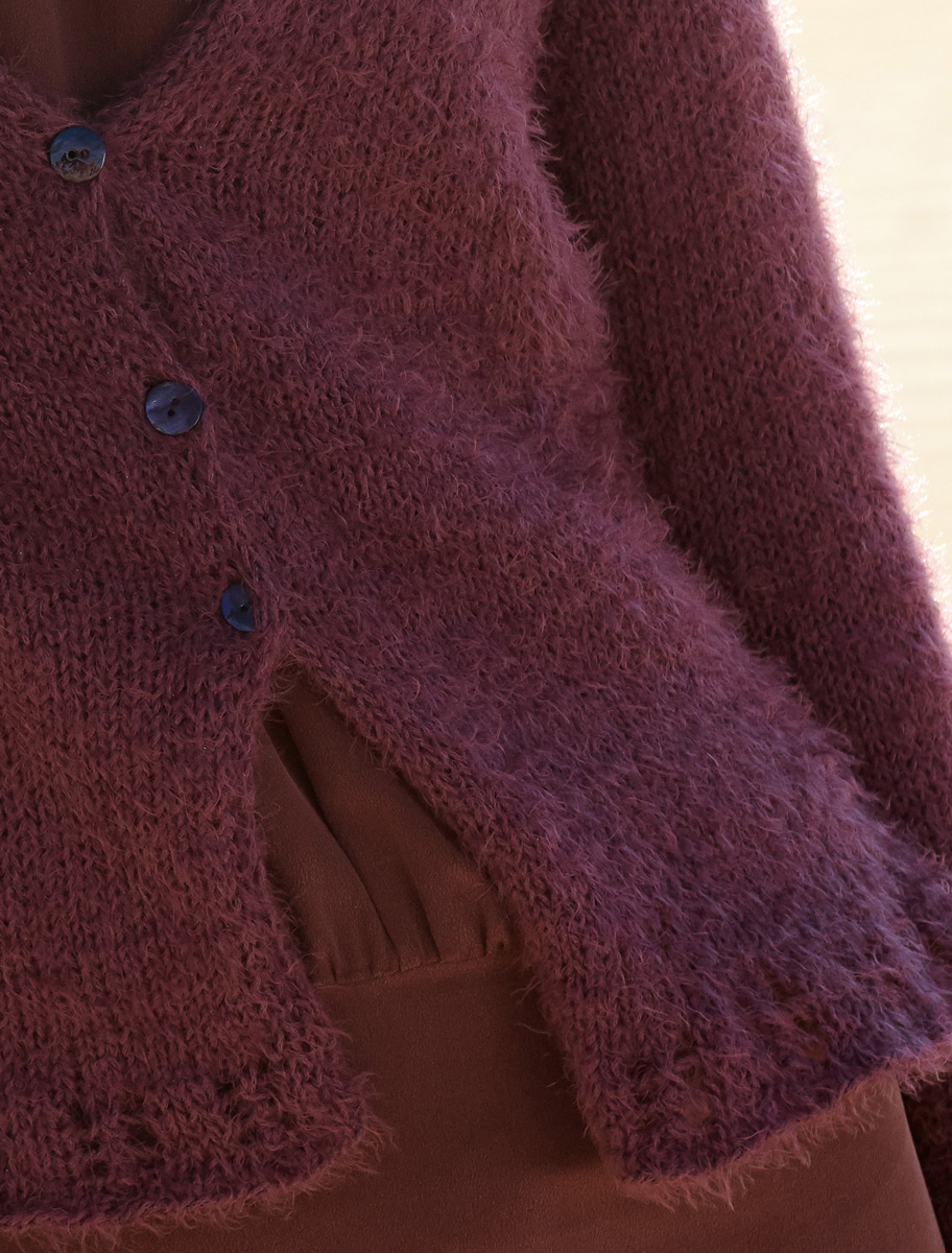 350 (400) g of Lana Grossa Estivo II (85% cotton, 15% polyamide; 150 m/50 g) in Blackberry (col 40). Size 6 mm needles; size 6 and 7 mm circular needles, each 80 cm long; three 15 mm mother-of-pearl buttons in aubergine [by Union Knopf, item 46286, col 68]