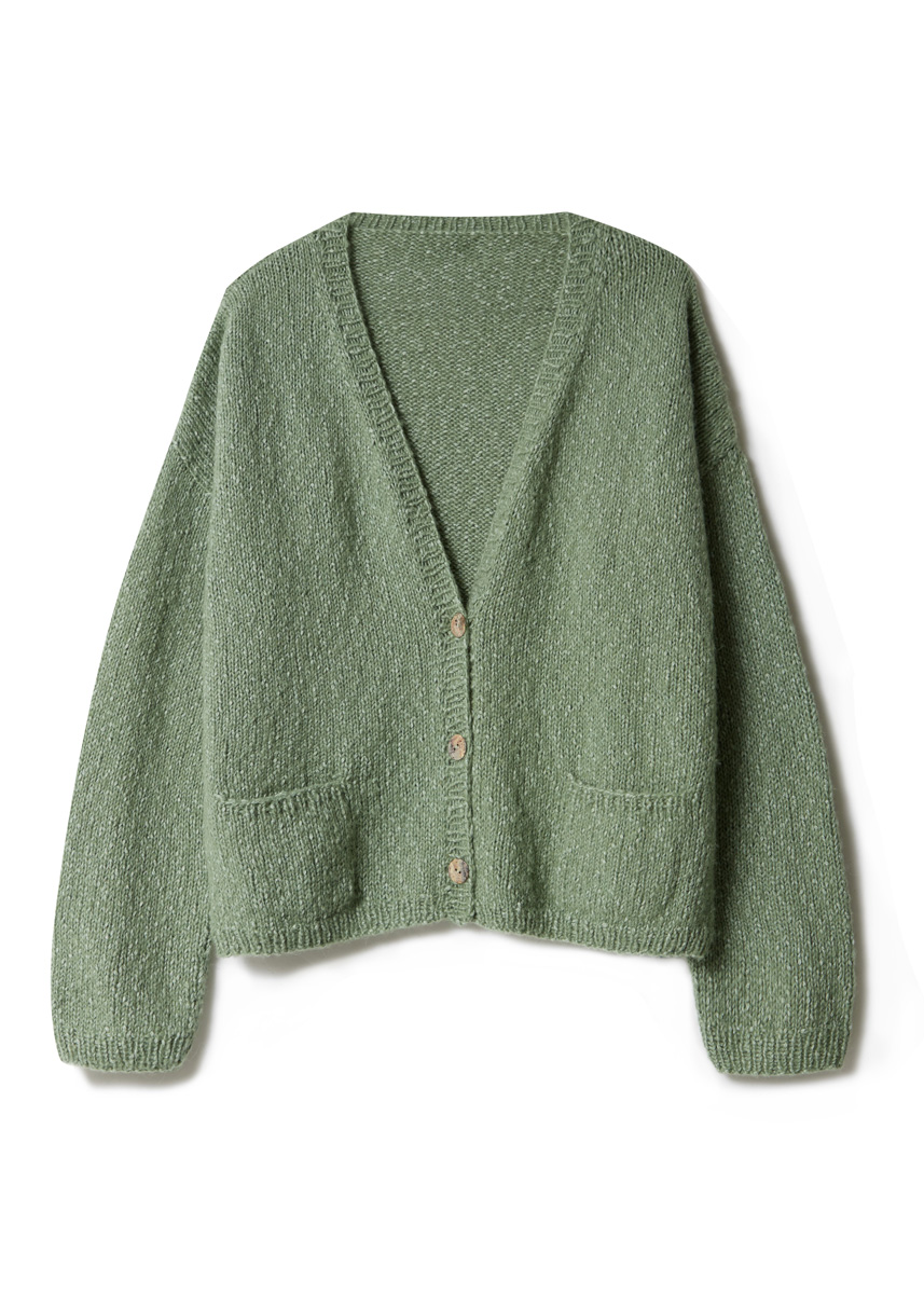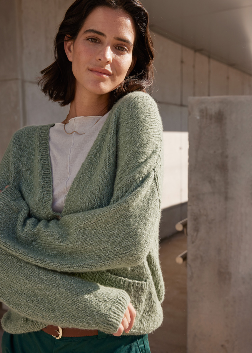 450 (500, 550) g of Lana Grossa Fantasia (50% cotton, 24% viscose, 16% baby alpaca, 10% extrafine Merino wool; 125 m/50 g) in Sage Green (col 12). Size 4.5 and 5 mm needles; size 4.5 mm circular needle, 100 cm long; three 20 mm buttons [by Union Knopf, item 37604, col 12].