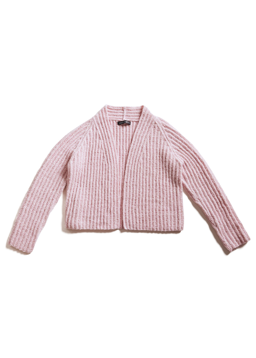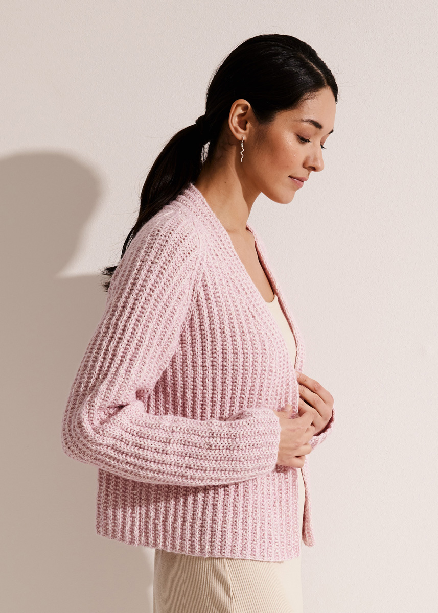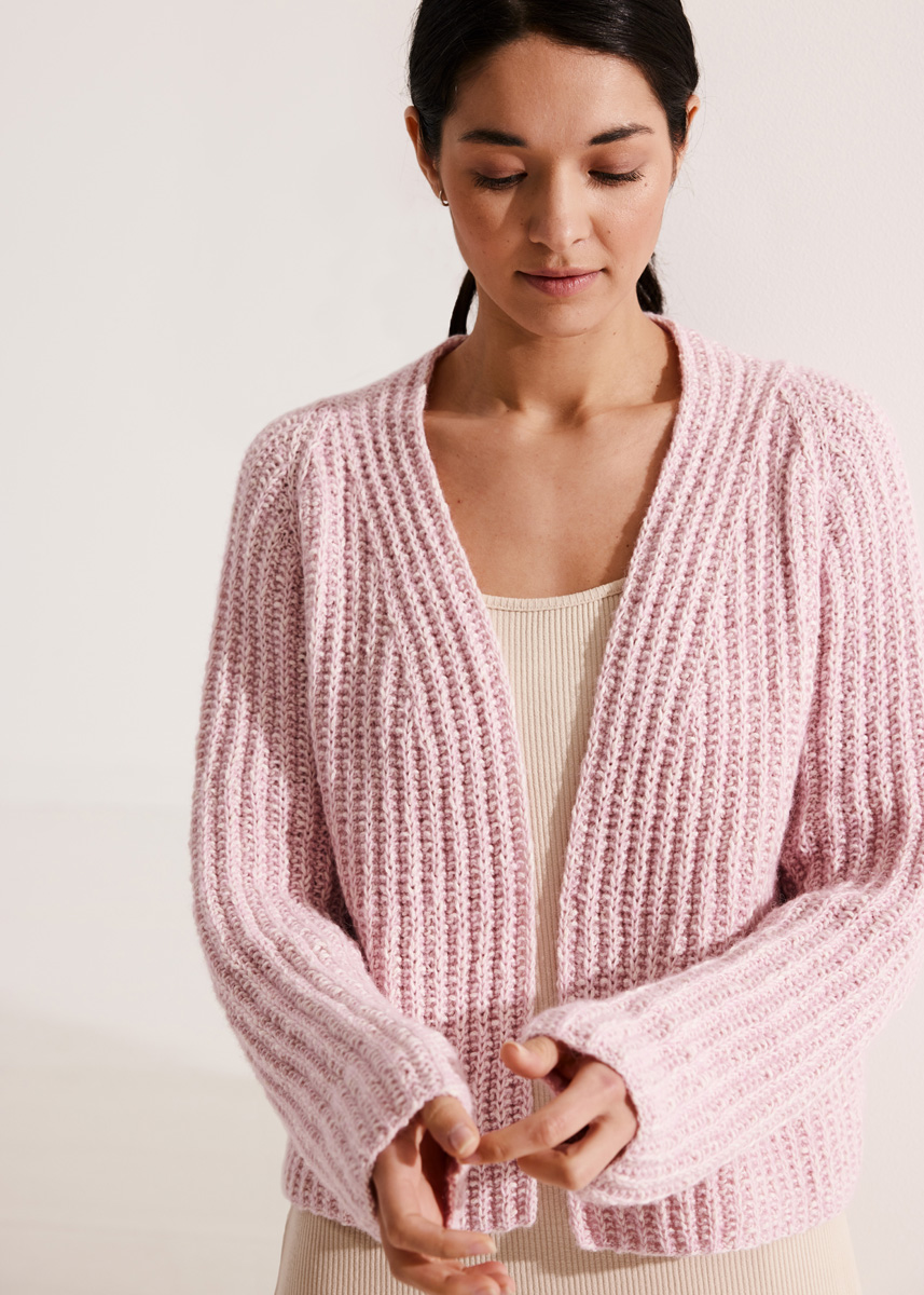 550 (600, 650) g of Lana Grossa Fantasia (50% cotton, 24% viscose, 16% baby alpaca, 10% extrafine Merino wool; 125 m/50 g) in Rosé (col 3). Size 4 mm needles