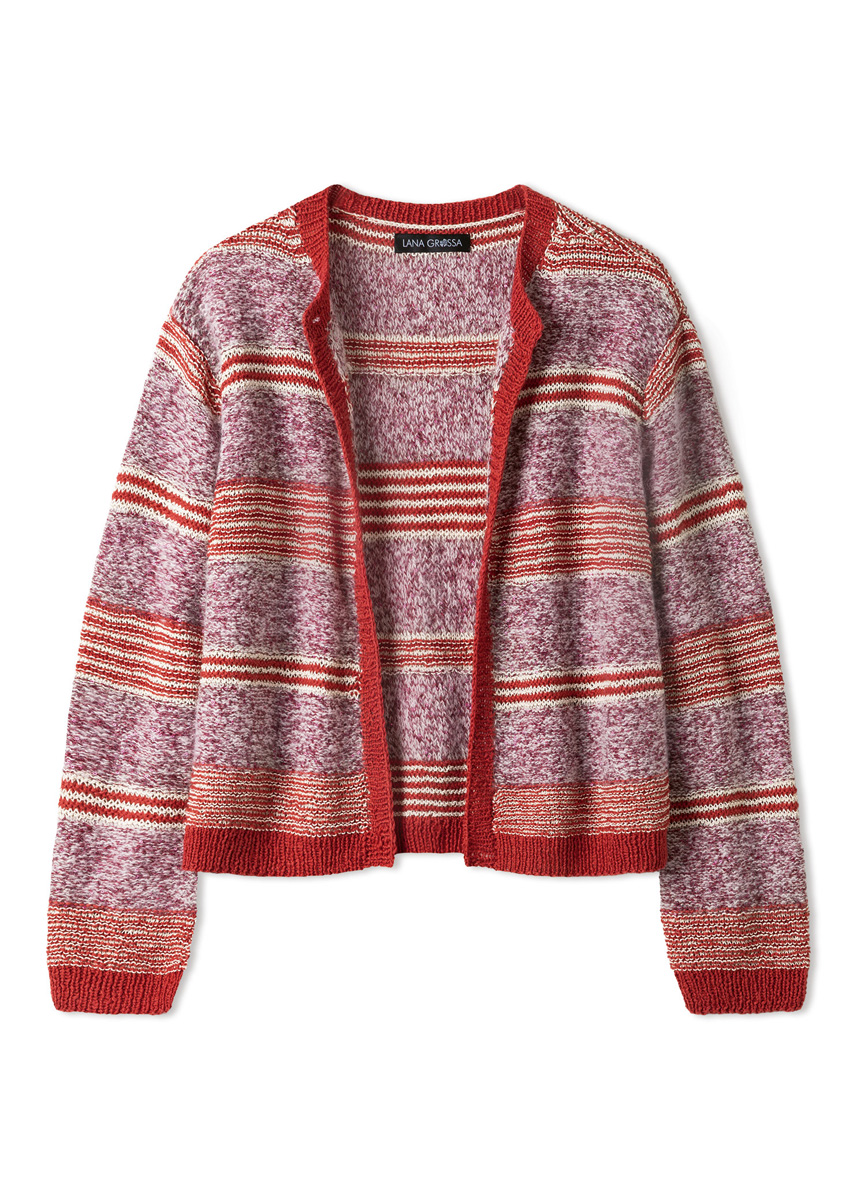 100 (150, 150, 200) g of Lana Grossa Summer Cashmere (90% cotton, 10% cashmere; 210 m/50 g) in Oriental Red (col 25); 75 (100, 100, 125) g of Lana Grossa Setasuri (69% Suri alpaca, 31% silk; 212 m/25 g) in Cream (col 2); 100 (100, 150, 150) g of Lana Grossa Filo Lurex (95% cotton, 5% polyester; 145 m/50 g) in Cream (col 2); 125 (125, 150, 150) g of Lana Grossa Glamour (55% polyamide, 45% polyester; 115 m/25 g) in Bordeaux (col 9). Size 3 and 4 mm needles; size 3 mm circular needle.