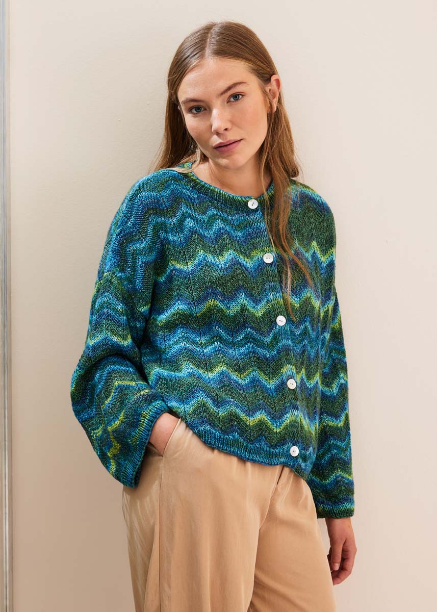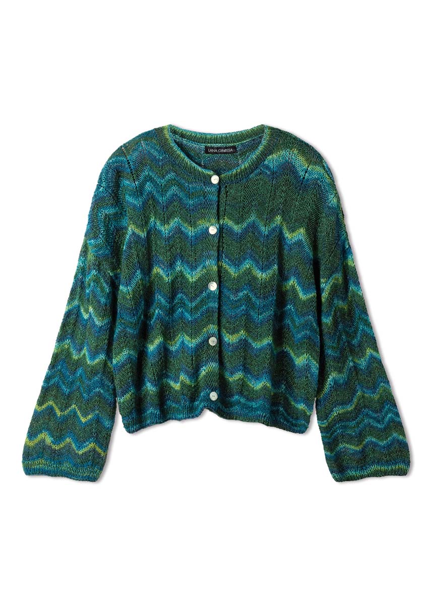 350 (450, 550) g of Lana Grossa Gianna (80% organic cotton, 15% Merino wool, 5% cashmere; 180 m/50 g) in Blue/Green/Turquoise/Grey (col 5). Size 4 and 4.5 mm needles; short size 4 mm circular needle; five 18 mm mother-ofpearl buttons.