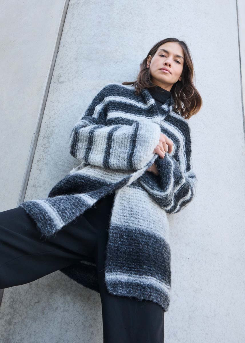 500 (500, 600, 600) g of Lana Grossa Gigante (70% fine alpaca, 30% polyamide; 300 m/100 g) in Silver Grey/Light Grey/Dark Grey/Charcoal (col 12). Size 4.5 and 5.5 mm needles.