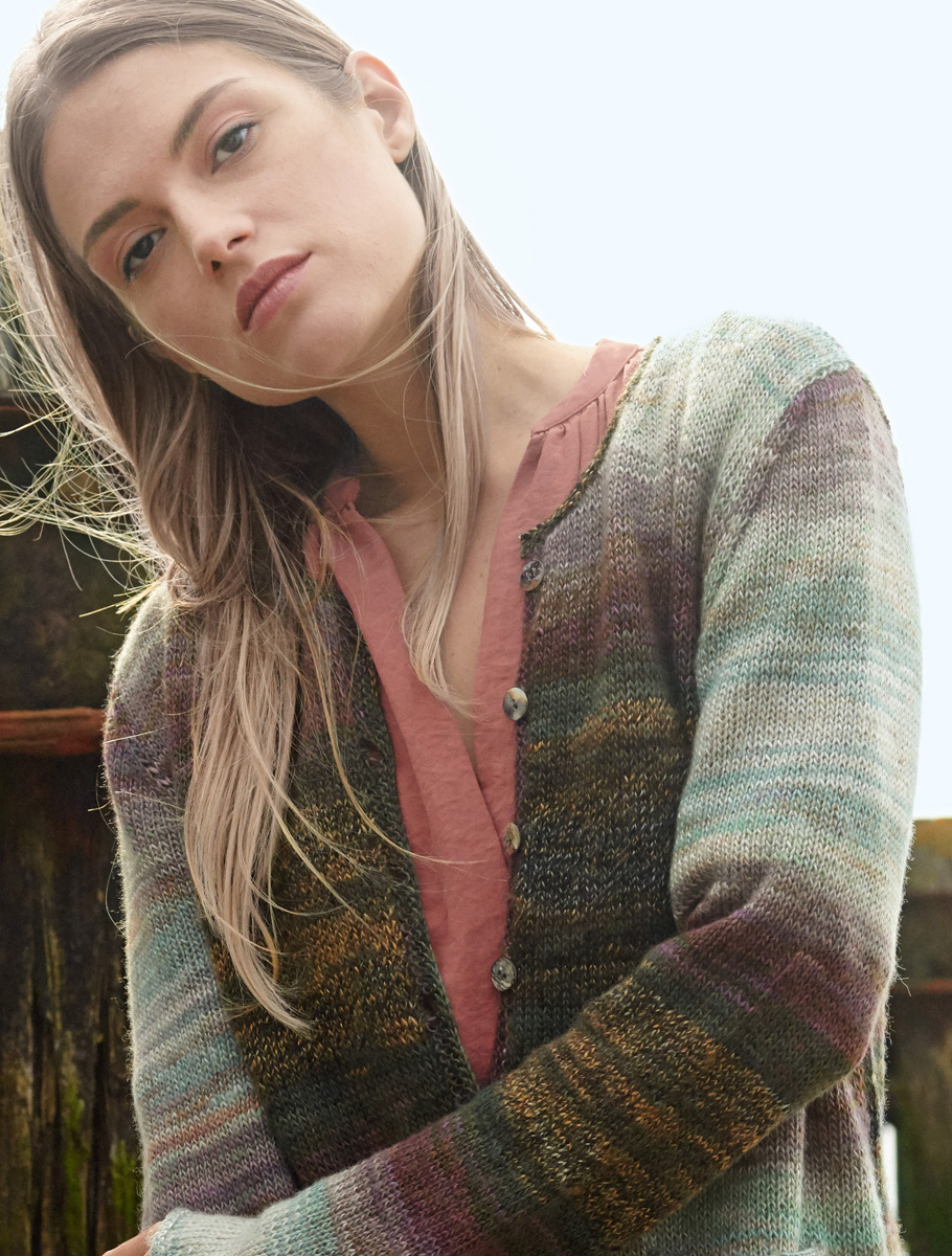 300 (400, 400) g of Lana Grossa Gioia (50% superwash Merino wool, 50% acrylic; 380 m/100 g) in Silver/ Mint/Pink/Mocha/Grey-Green/Black (col 101). Size 3.5 and 4 mm needles; size 3.5 mm circular needle, 60 cm long; eight 15 mm mother-of-pearl buttons in beige/brown [by Union Knopf, item 46286, col 14]