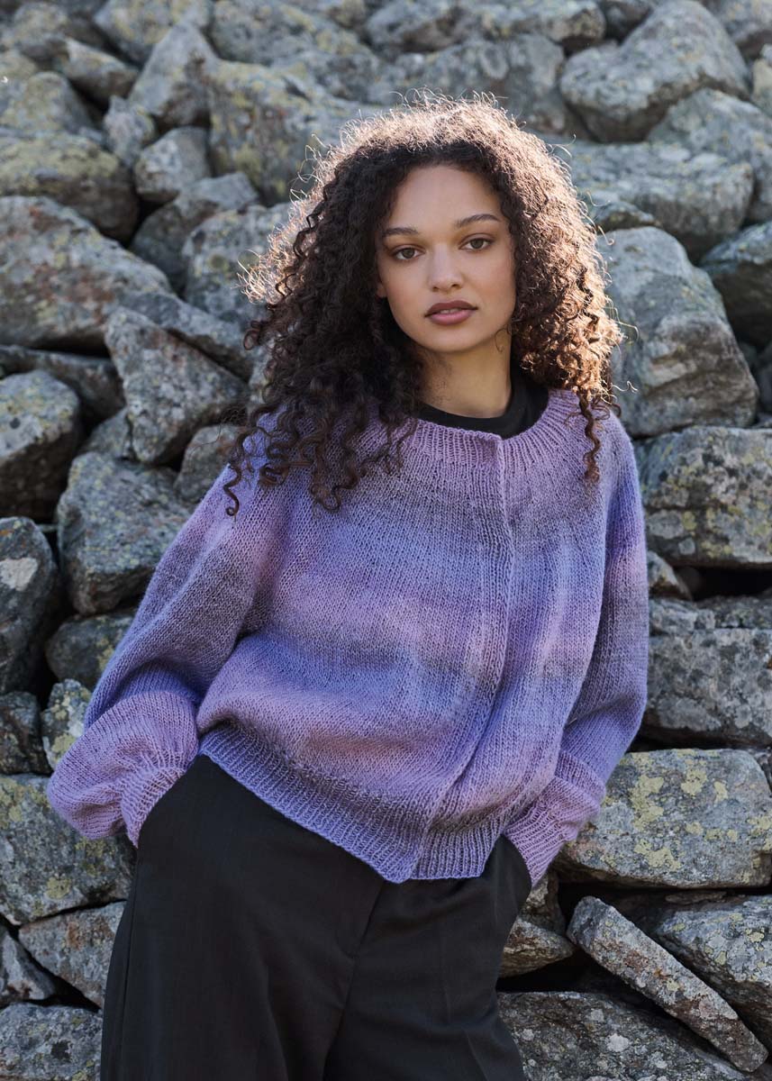 400 (400, 400, 600) g of Lana Grossa Gomitolo Gala (60% pure wool, 38% acrylic, 2% polyester; 700 m/200 g) in Lilac/Mauve/Grey Purple/Blue Purple/Violet Blue (col 4027). Short and long size 4 and 4.5 mm circular needles; one set size 4 mm double-pointed needles [dpns]; five 20 mm snap buttons.